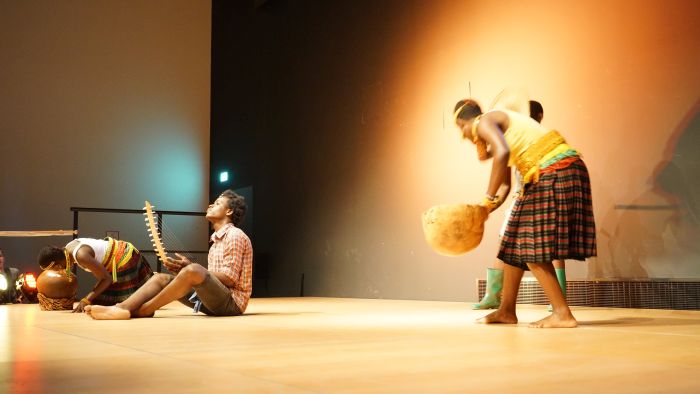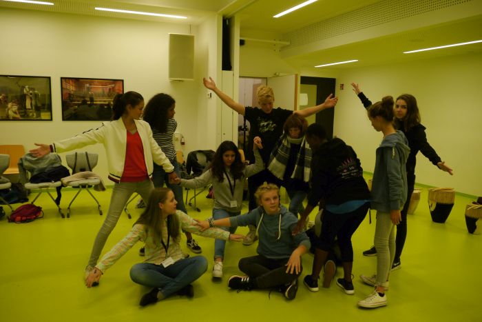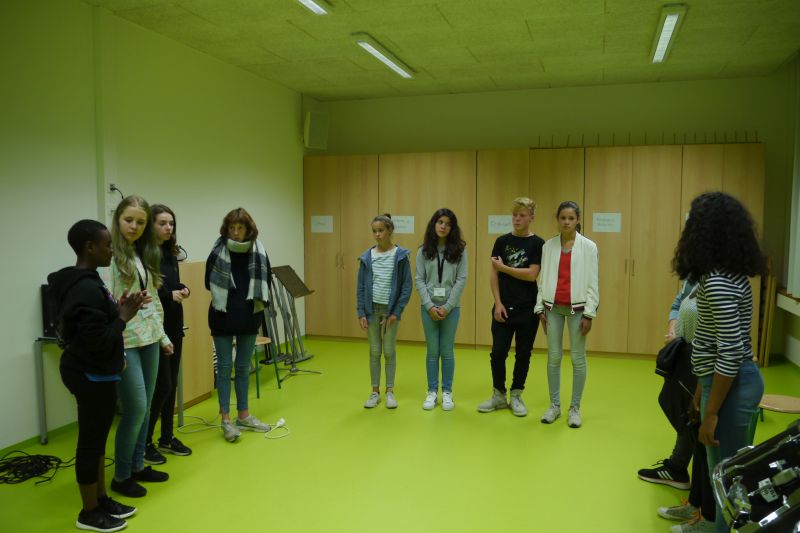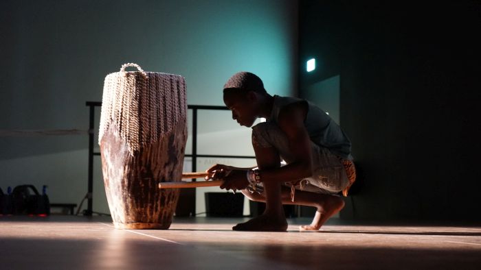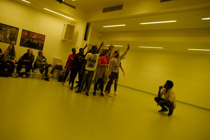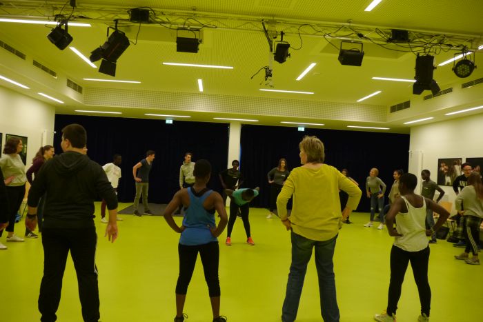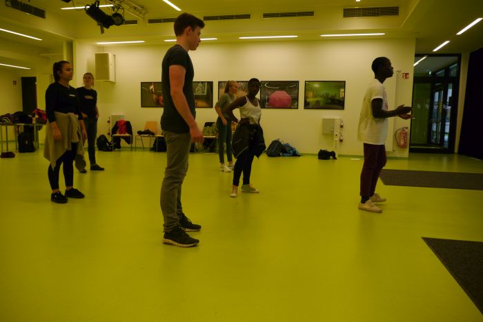 Die Schüler*innen der Klasse 10b hatten die ganze Woche über engagiert und intensiv sowohl zu Themen des globalen Klimawandels gearbeitet als auch Trainings in Tanz, Trommeln und Schauspiel absolviert. Vieles war neu und ungewohnt – besonders die körperliche und kreative Arbeit verlangte den Jugendlichen einiges an Konzentration, Körpereinsatz und auch Überwindung ab. Manch eine*r, der oder die anfangs mit Skepsis und großer Zurückhaltung auf die Begegnungswoche mit SUDA geschaut hatte, musste innere Grenzen überschreiten. Doch es lohnte sich: alle sammelten neue Erfahrungen mit der eigenen Rolle im Gruppenprozess, mit Ausdruck und Präsenz auf der Bühne.