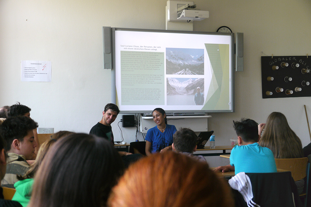 Die Schüler*innen hatten dabei die Möglichkeit, Fragen zu stellen und die vorgestellten Themen zu diskutieren: So wurde zum Beispiel anlässlich des Gerichtsprozesses zum Fall Huaraz darüber diskutiert, welche und wie viel Verantwortung ein deutsches Unternehmen für den Klimawandel und dessen Auswirkungen in Peru haben kann bzw. übernehmen sollte. Viele Schüler*innen haben nach der Begegnung angemerkt, dass sie nun ein besseres Verständnis für die Probleme anderer Länder besäßen und mehr über ihr eigenes Verhalten nachdenken würden.