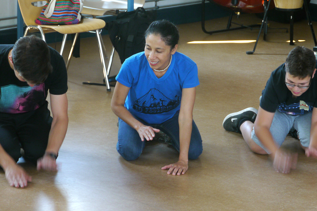 Auch die praktischen Übungen kamen bei Ana Sofias Besuch nicht zu kurz: Bei ihrer ersten Station an der Ilse-Löwenstein-Schule in Hamburg-Uhlenhorst stellte sie peruanische Tänze und traditionelle Rhythmen auf der Cajón (peruanisches Schlaginstrument) vor. Am Gymnasium Lohbrügge wurden unter anderem Theaterszenen zum Klimawandel entwickelt. Die letzte Station war die Lessing-Stadtteilschule in Sinstorf, an der die Schüler*innen mit  Ana Sofia spielerische Choreografien vorgeführt haben. Mit einem traditionellen Ritual und Dank an die Pachamama verabschiedete sich Ana Sofia von der Klasse. Alle freuen sich bereits auf die Besuche der ganzen Gruppe, die ab August stattfinden werden.