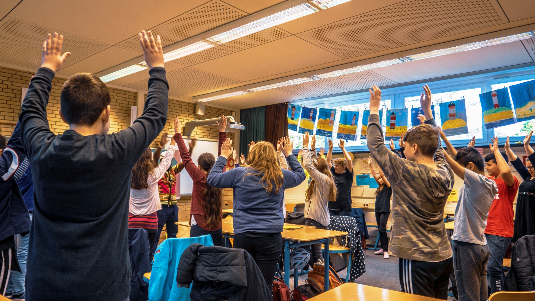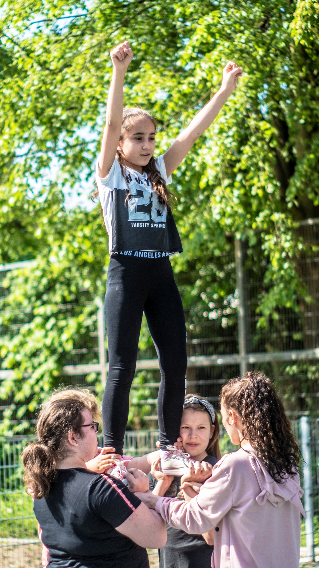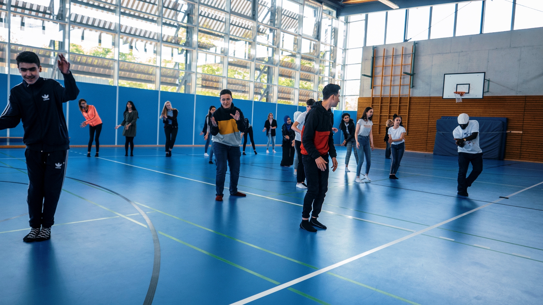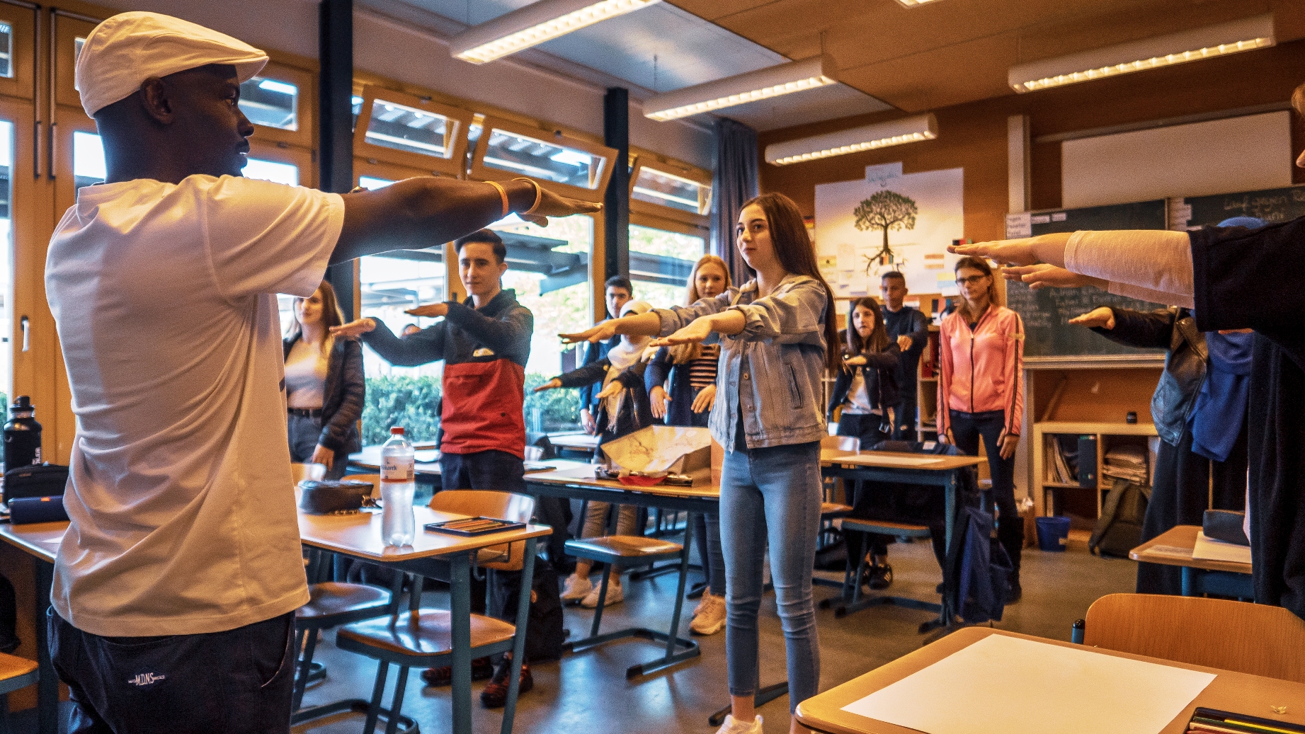 Neben diesen Lektionen erzählt er viel über die Geschichte und Arbeit von Sosolya und macht Bewegungs- und Tanzübungen mit den Jugendlichen. Auch die Schüler*innen haben einiges vorbereitet. was sie ihrem Gast zeigen wollen. Besonders beeindrucken einige Schüler*innen der Kl. 6c von der Stadtteilschule Eidelstedt mit ihren akrobatischen Übungen.