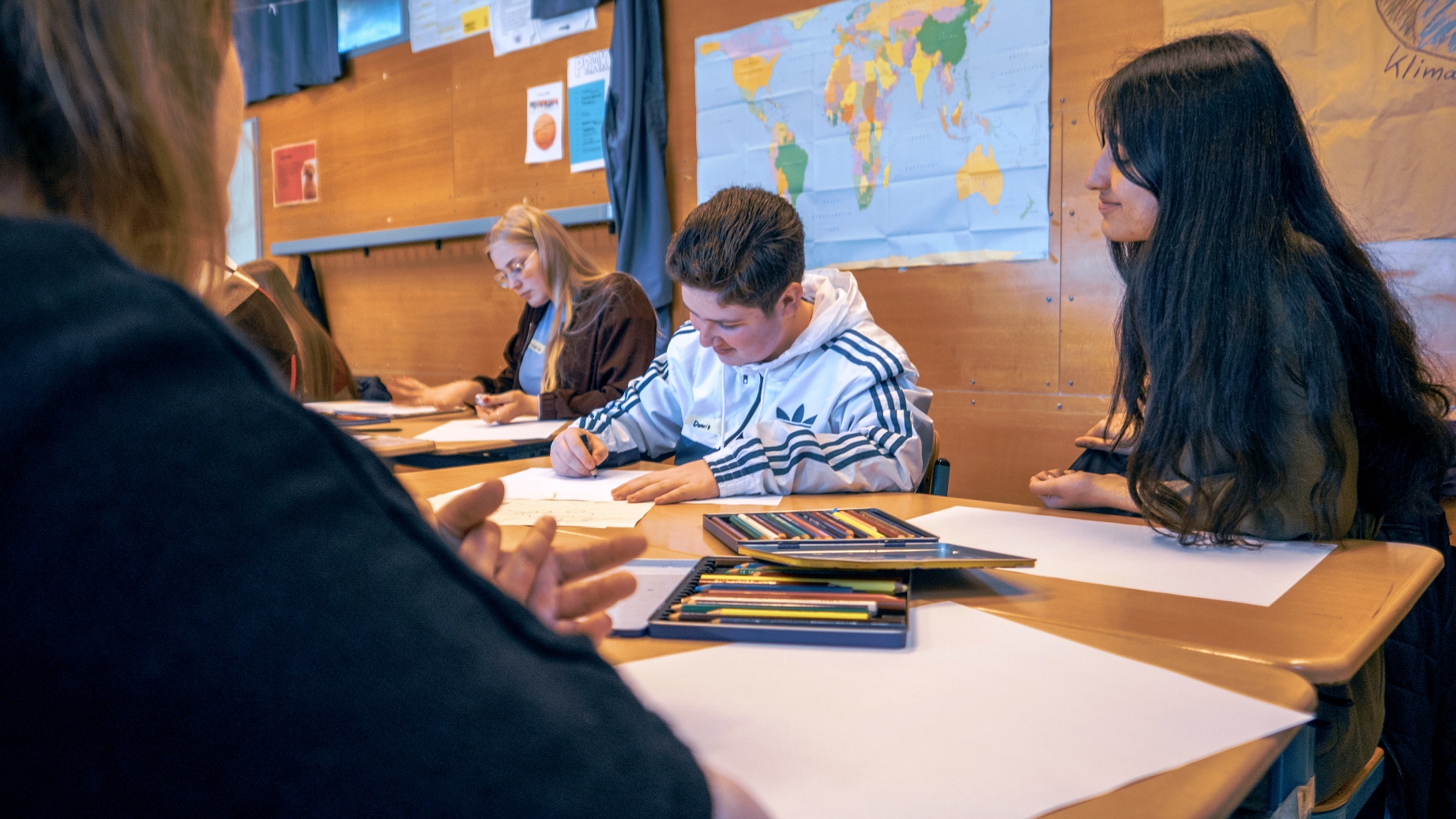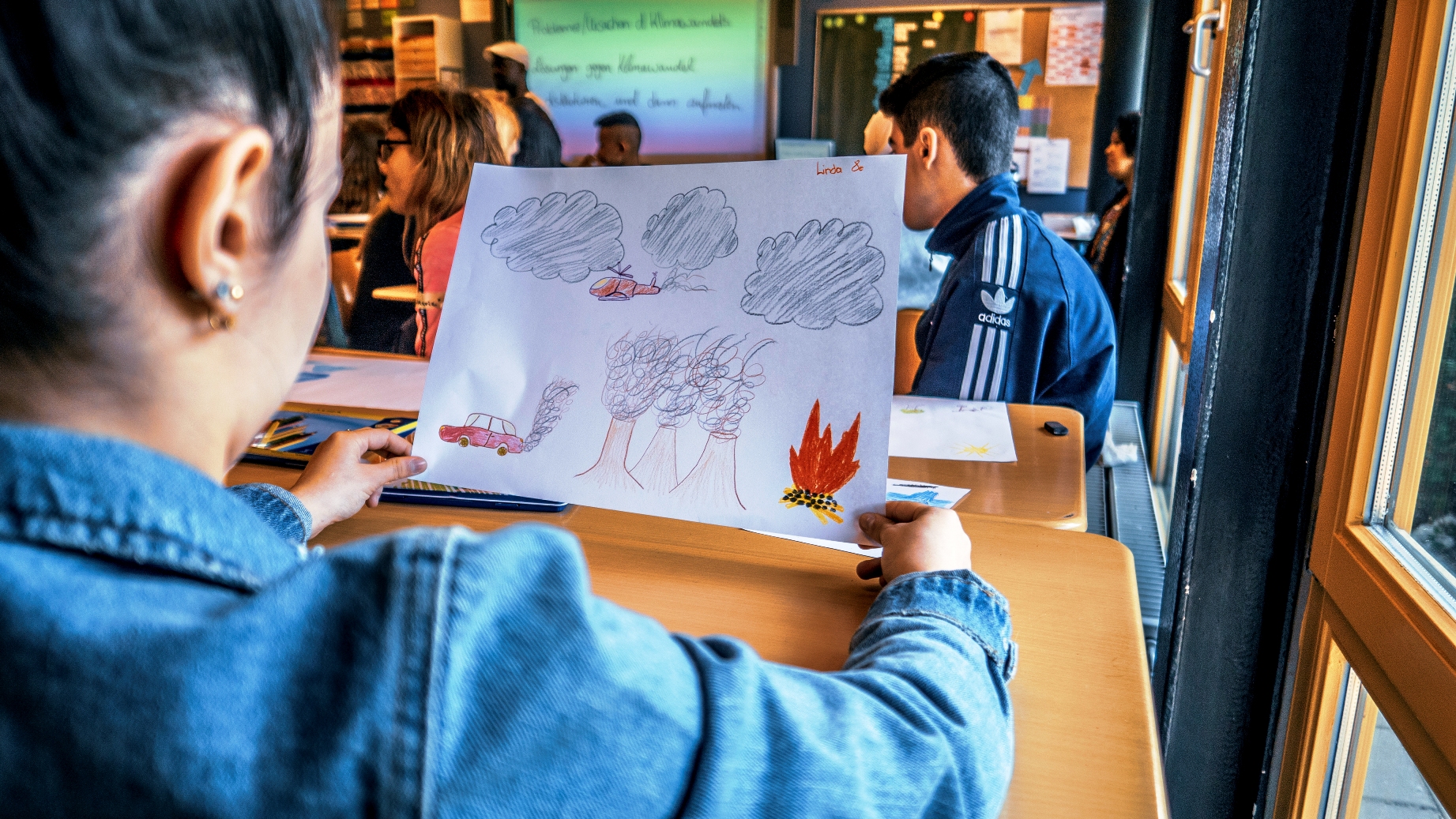 So lautete eine Aufgabe, die die Jugendlichen in Bildern auf Papier bringen und präsentieren sollten. Es fällt ihnen unterschiedlich schwer. Probleme wie „zu viele Autos“, „Waldrodung“, „Umweltverschmutzung“ oder „Plastikmüll“ sind schnell benannt – in der 6. genauso wie in der 8.Klasse. Aber mit den Lösungen und vor allem den Wegen dorthin – da wird es schon schwieriger. Aber das geht den Erwachsenen ja nicht anders.