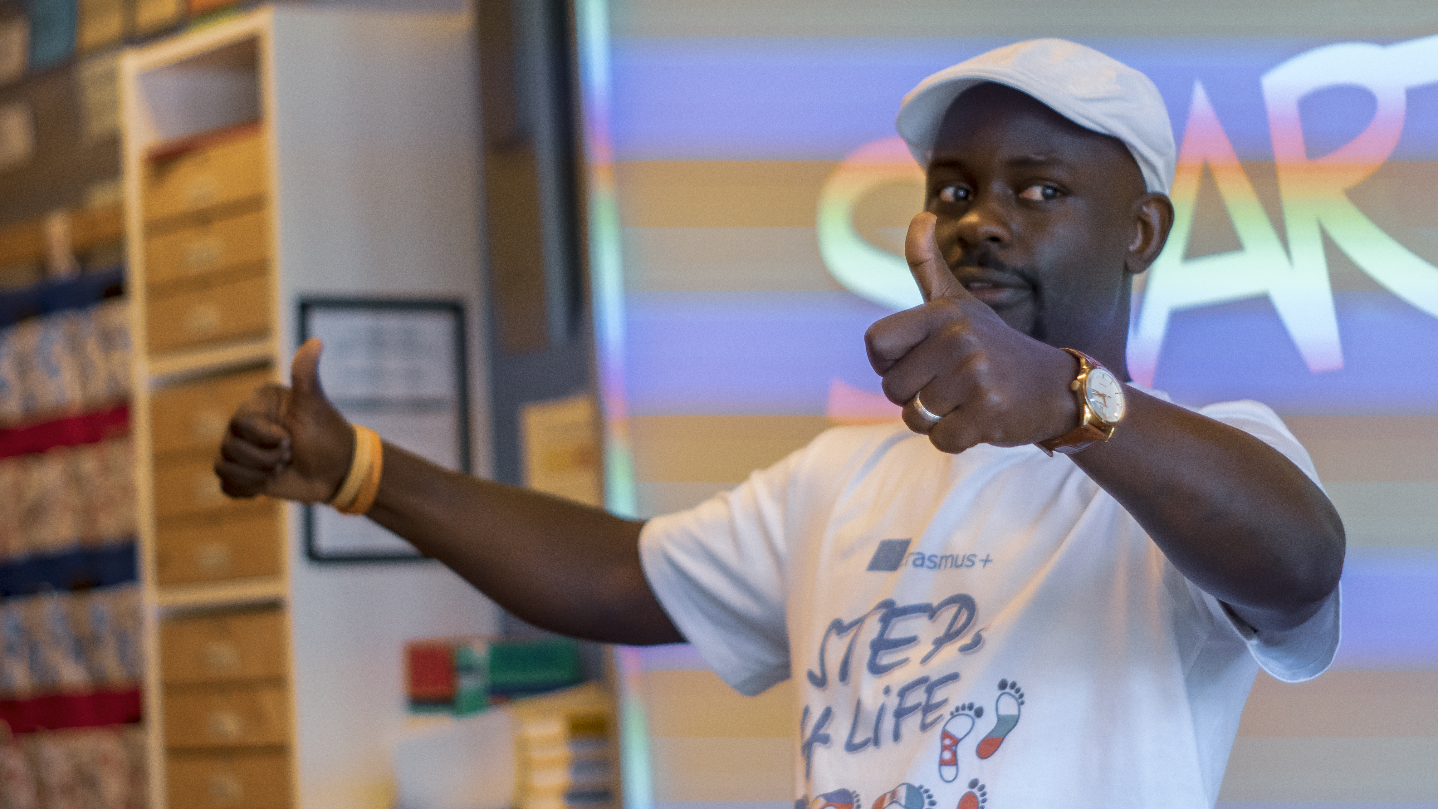 Gut gelaunt und voll kreativer Ideen besuchte Bagonza Herman Katoroogo, der künstlerische Leiter der Sosolya Undugu Dance Academy, in der letzten Woche die CREACTIV-Klassen der Stadtteilschule Eidelstedt und der Gretel-Bergmann-Schule in Neu-Allermöhe. Frisch zurückgekehrt aus New York, wo er u.a. Jugendliche und Studierende in Tanz und Musik unterrichtet, war er nun neugierig auf die Hamburger Schüler*innen. Es war sein erster Besuch in Hamburg und in Deutschland. Sein erster Eindruck: „Es ist so unfassbar grün hier, it blew my mind, überall Bäume und Parks…das gibt es höchstens bei uns in den teuren Wohngegenden am Stadtrand, aber nicht mitten in der Stadt und an den Hauptverkehrsstraßen. Das ist phantastisch, bitte passt weiterhin so gut auf eure Stadt auf, denn wir brauchen die Bäume zum Leben…“