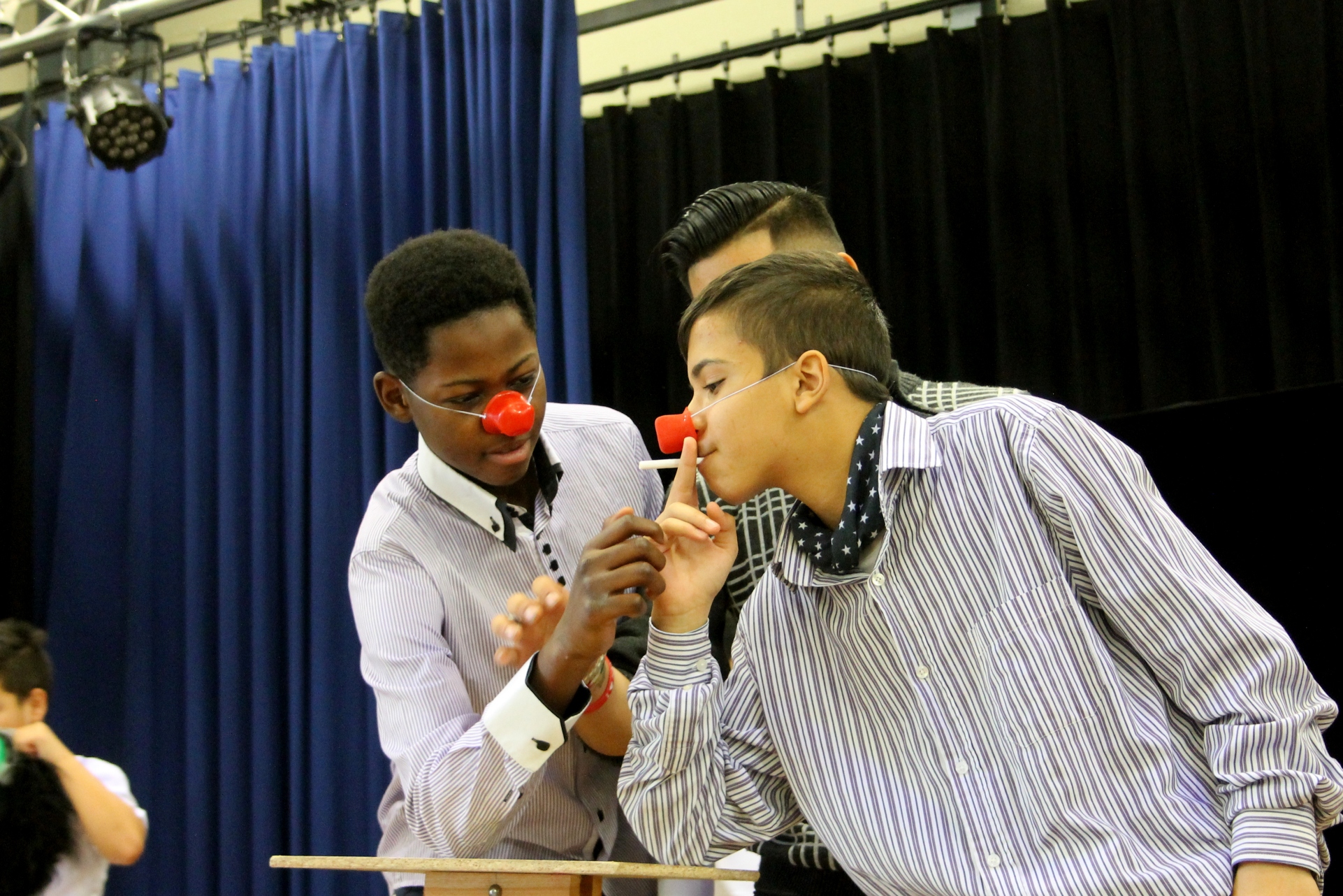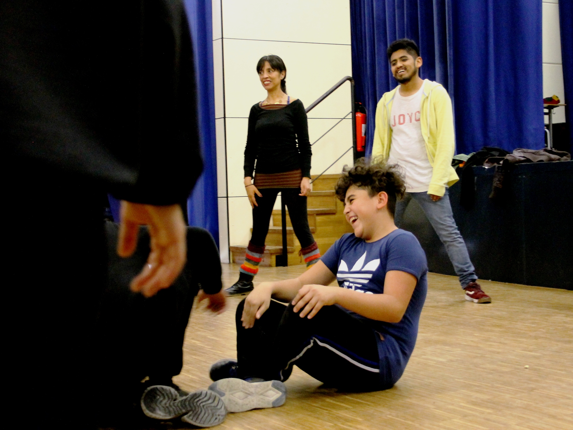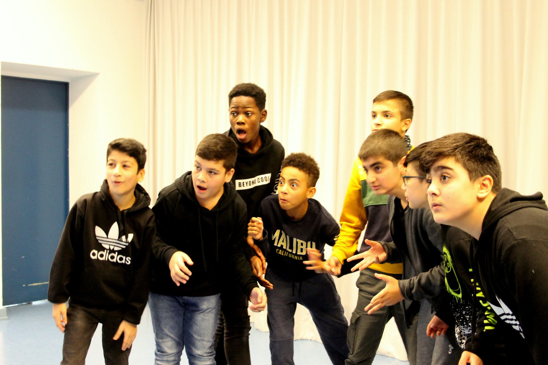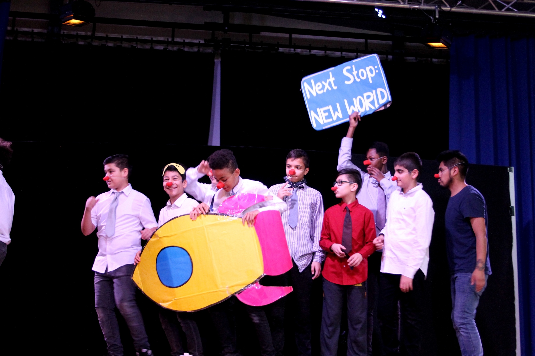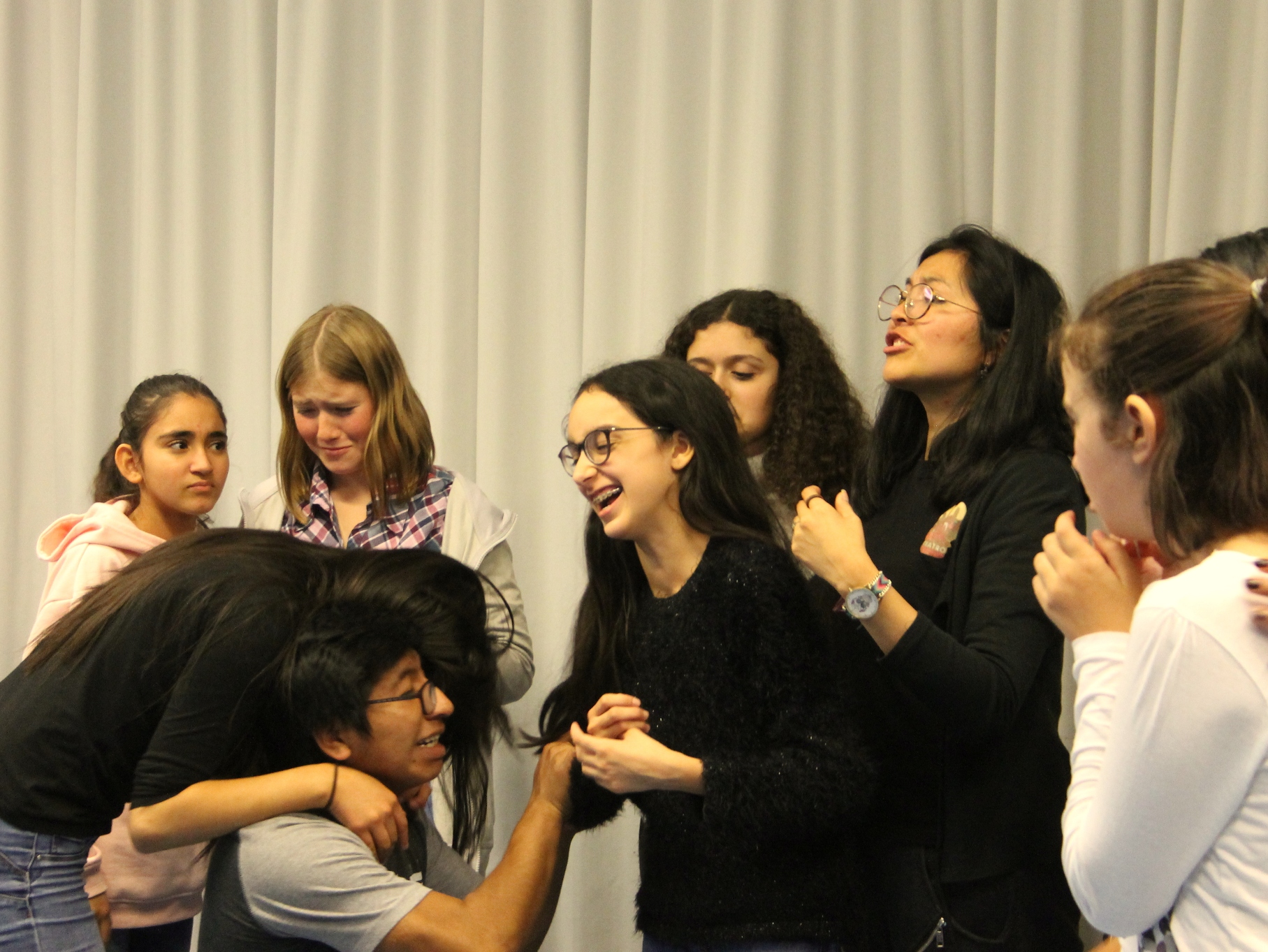 Nach einigem Überlegen entschließt sich die Klasse, für die Abschlusspräsentation am Stück von Teatro Trono teilzunehmen, und beginnt von dort an, fleißig dafür zu üben. Ob Clown, Bevölkerung oder Kakerlake – alle Schüler*innen finden eine Möglichkeit sich einzubringen und sind in den nächsten Tagen mit voller Konzentration dabei. Auch nach dem dritten Durchlauf des Stücks am Donnerstag lautet die Antwort auf die abschließende Frage „Wie fühlt ihr euch?“ – „Sehr gut!“