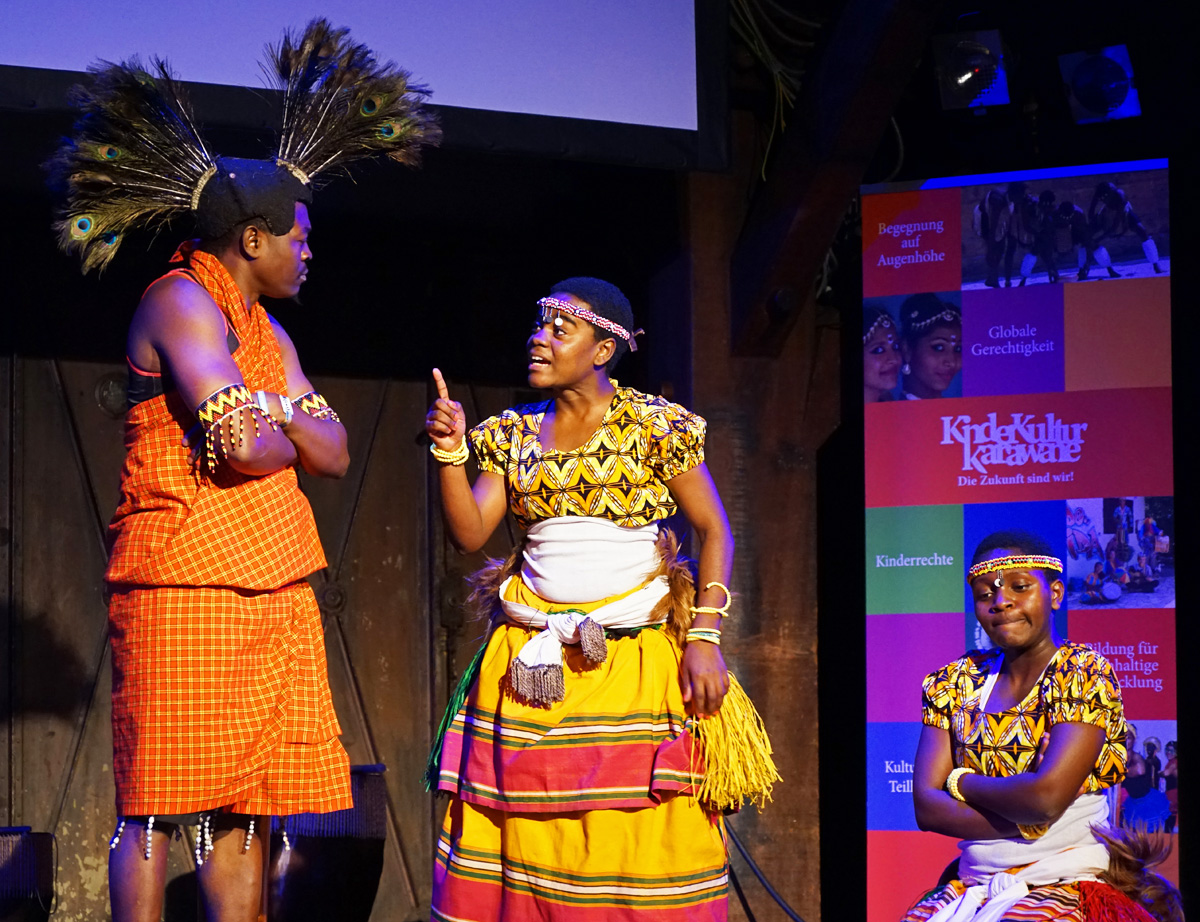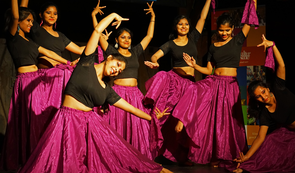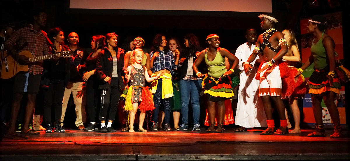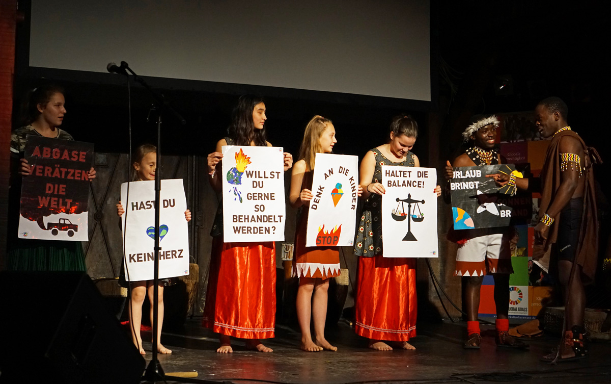 Sosolya präsentierte rasante traditionelle Tänze, umwerfende Trommelrhythmen und Szenen aus ihrem Stück zum Klimawandel „Kwafe kwe Kwafe“ und involvierte dabei auch einige hiesige Schüler*innen; Teatro Trono zeigte ebenso tiefgreifende wie witzige Theaterszenen über Klimawandel und Gerechtigkeit und brachte gemeinsam mit Schüler*innen des Eric-Kandel-Gymnasiums selbst erarbeitete Szenen auf die Bühne. Und die Gruppe Stop beeindruckte mit modernen und traditionellen indischen Tänze sowie ausgefeilten Bollywood-Choreographien das zahlreich erschienene Publikum.