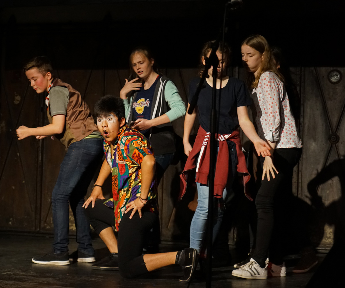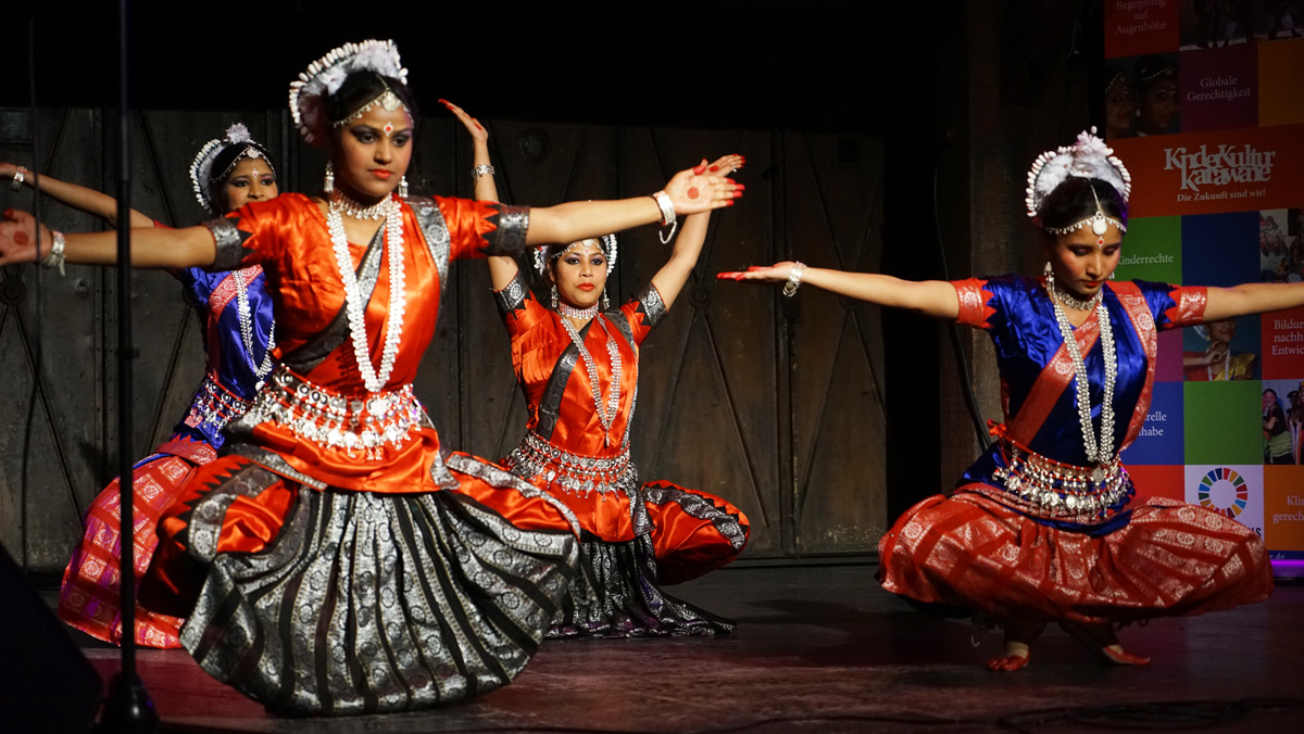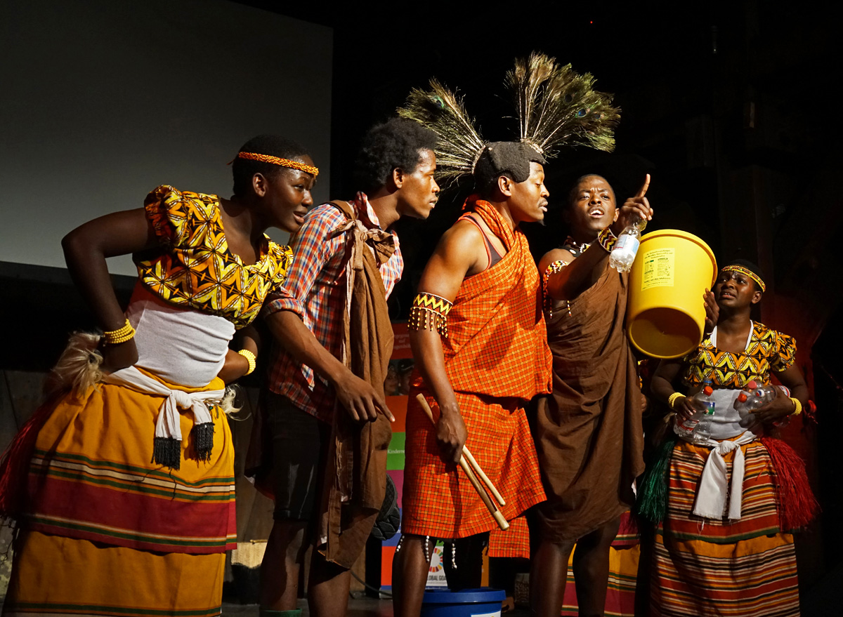 Sosolya präsentierte rasante traditionelle Tänze, umwerfende Trommelrhythmen und Szenen aus ihrem Stück zum Klimawandel „Kwafe kwe Kwafe“ und involvierte dabei auch einige hiesige Schüler*innen; Teatro Trono zeigte ebenso tiefgreifende wie witzige Theaterszenen über Klimawandel und Gerechtigkeit und brachte gemeinsam mit Schüler*innen des Eric-Kandel-Gymnasiums selbst erarbeitete Szenen auf die Bühne. Und die Gruppe Stop beeindruckte mit modernen und traditionellen indischen Tänze sowie ausgefeilten Bollywood-Choreographien das zahlreich erschienene Publikum.
