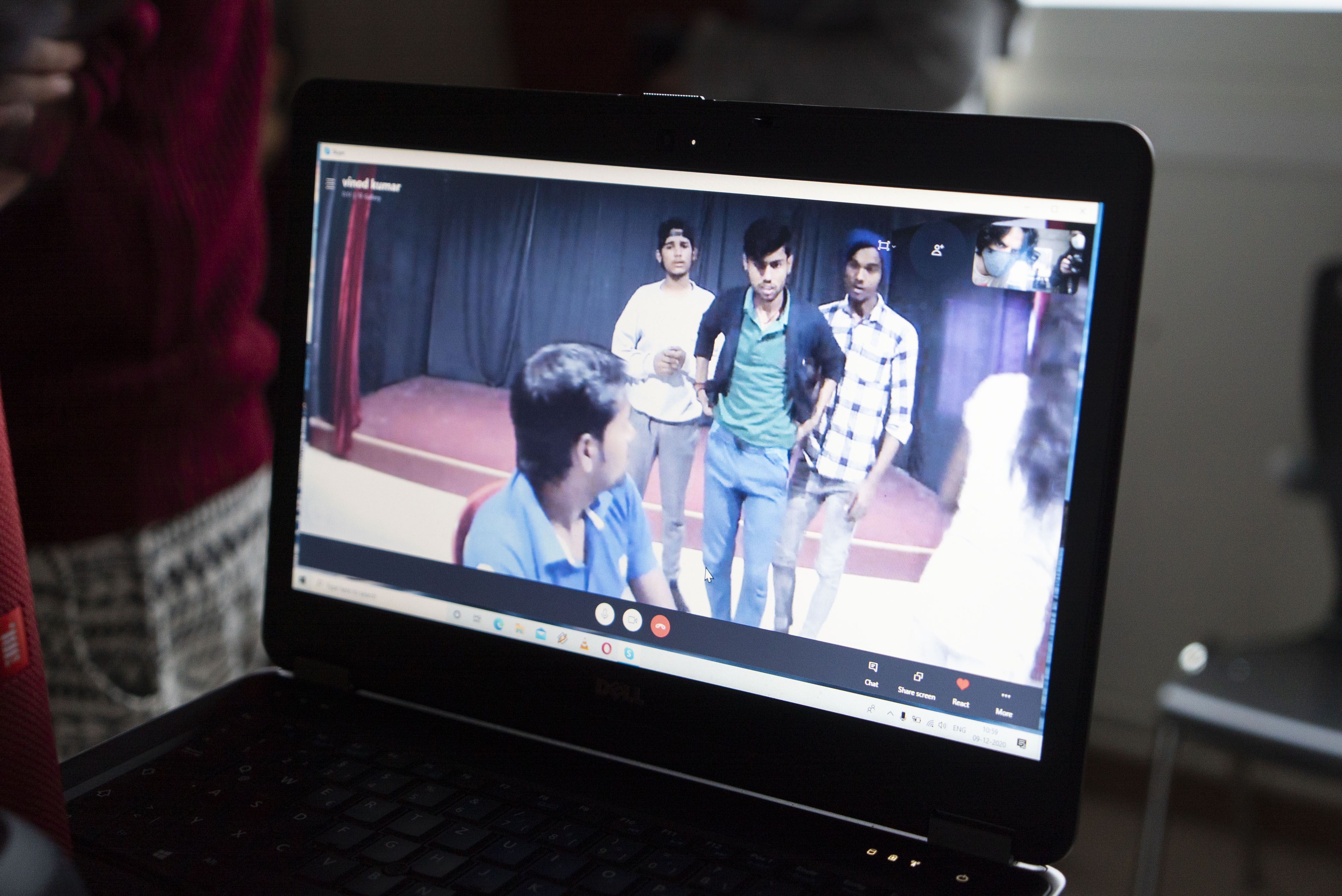 Ähnlich geht es dem nächsten Kurs, der den Theatersaal betritt. Der Theaterkurs der 11ten Klasse hätte eigentlich die letzte Stunde vor der Matheklausur zur Vorbereitung nutzen wollen, aber die Neugier auf den Gast aus Indien war stärker. Auch hier geht es gleich los: Nach einem kurzen Einführungsfilm über die Dreamcatchers und ihre Arbeit geht es direkt zum Tanzen über und alle sind voller Konzentration und Spaß dabei. Die Schritte werden schneller und die Choreographie komplizierter, aber davon lässt sich niemand aus der Ruhe bringen. Ganz im Gegenteil: „Voll cool – kannst du das mal mit dem Handy filmen?“ hören wir nicht zum letzten Mal an diesem Tag. Nach einer Stunde wird es ruhiger, aber nicht weniger intensiv: In einem Live-Chat mit den Dreamcatchers können die Schüler*innen ihre ganz persönlichen Fragen loswerden und das sind so viele, dass nicht alle gestellt werden können. „Können wir bitte in der nächsten Theaterstunde nochmal tanzen?“ ist die große Bitte der Schüler*innen an ihre Lehrerin am Ende der Stunde.