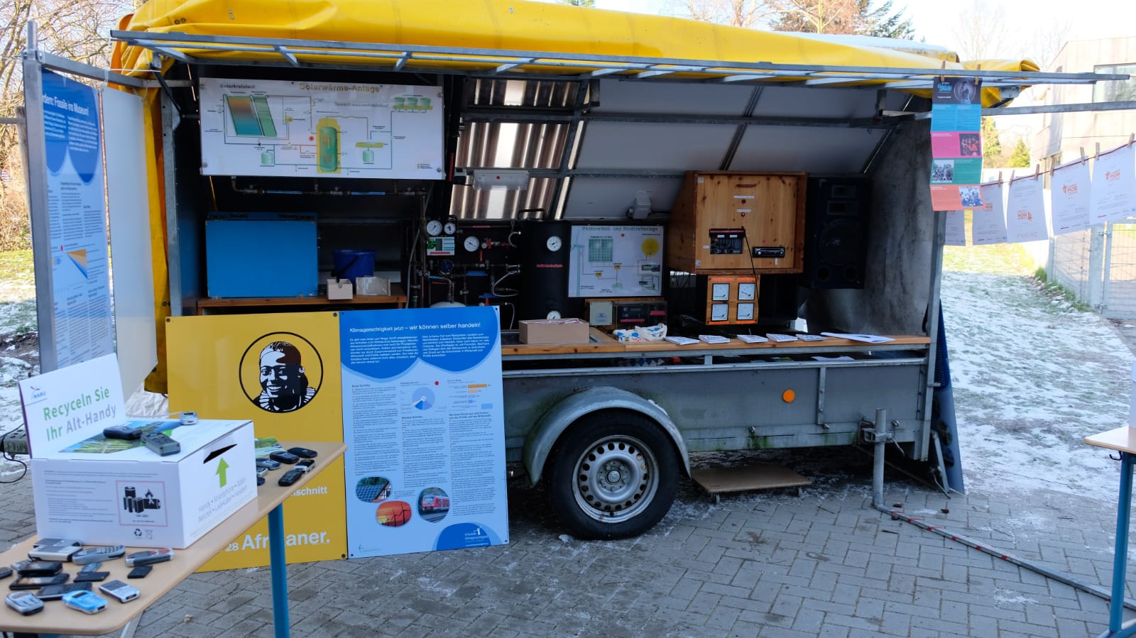 Die Klasse 8e, die bereits zum 2. Mal bei CREACTIV teilgenommen hat und deren Schüler*innen quasi schon Klima-Profis waren, bereitete sich auf das Thema fossile und erneuerbare Energieträger vor. Für den Tag der Offenen Tür gestalteten die Jugendlichen die sog. „Solarinsel“ (einen Anhänger mit Lernstationen zum Thema Erneuerbare Energien) mit Beiträgen über die Aktivitäten der Schule.
