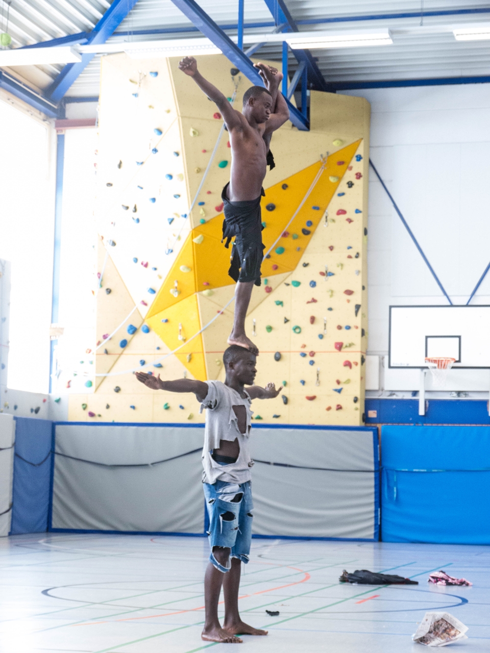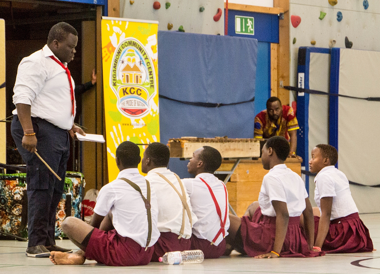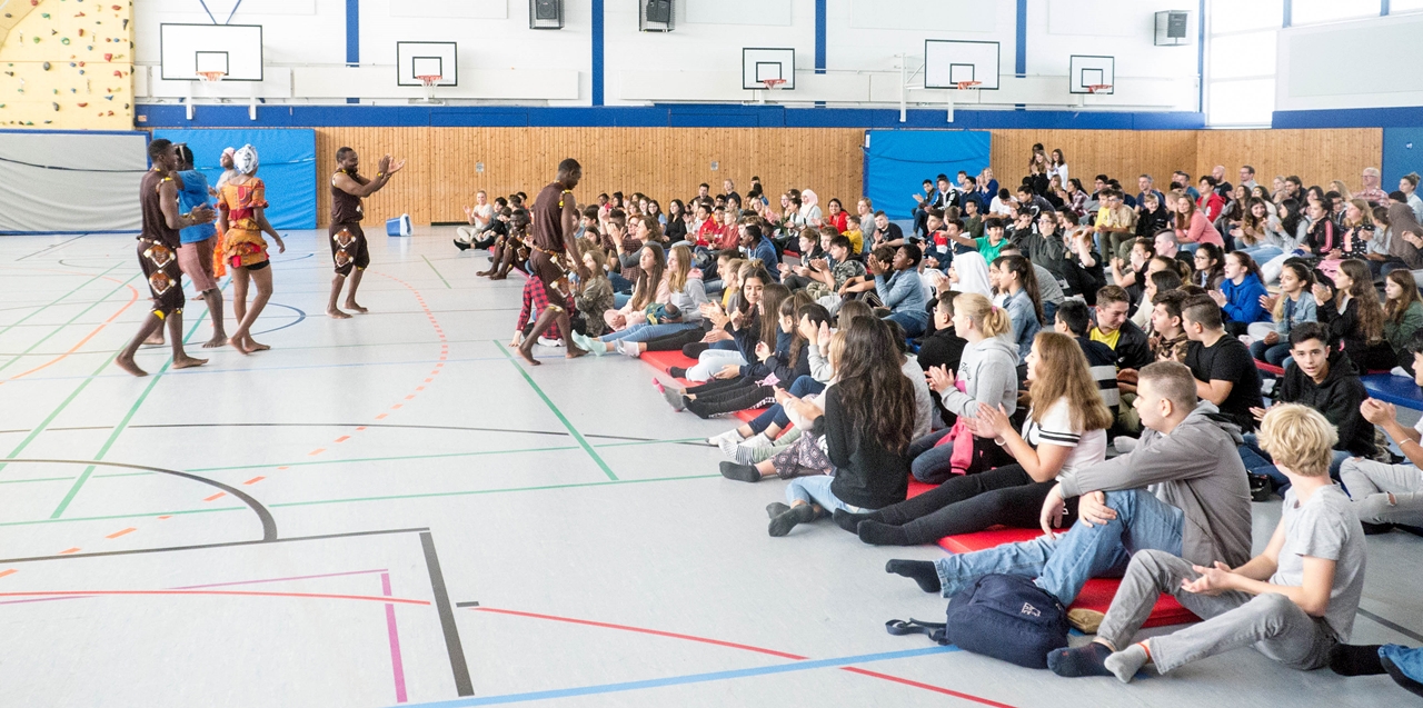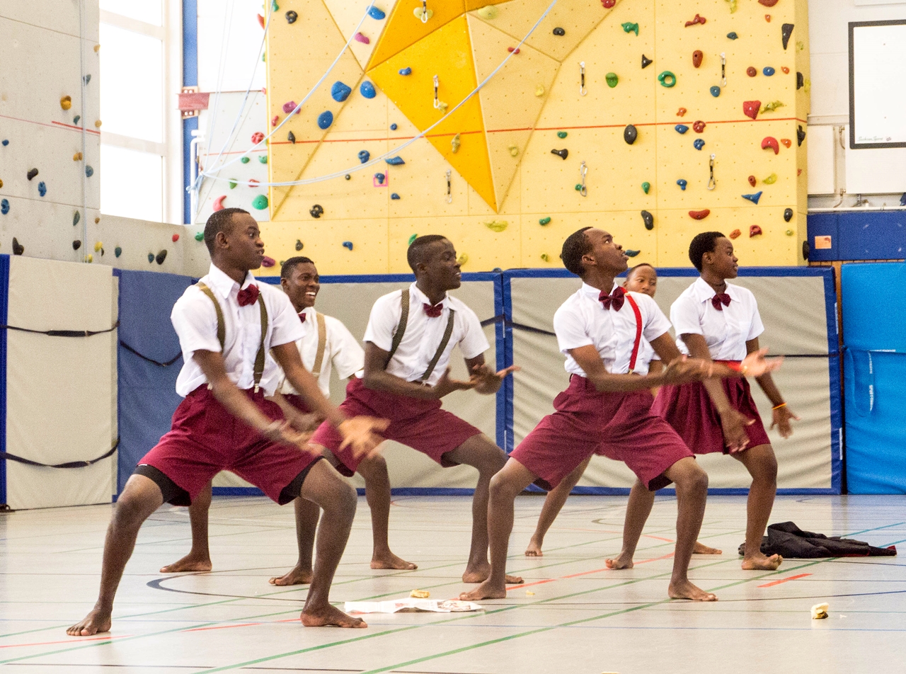 In der vollen Schulturnhalle präsentierten die jungen Künstler*innen ihr Können vor einem begeisterten jungen Publikum. Besonders gefielen den Siebt- und Acht-Klässler*innen die coolen Tanzeinlagen und die waghalsigen Akrobatikdarbietungen. Mit Szenenapplaus unterstützten sie die tansanischen Gäste und als dann zum Schluss das berühmte „Pata Pata“ erklang, hielt es Lehrer*innen wie Schüler*innen nicht mehr auf ihren Plätzen:  gemeinsam mit KCC tanzten sie durch die Halle.