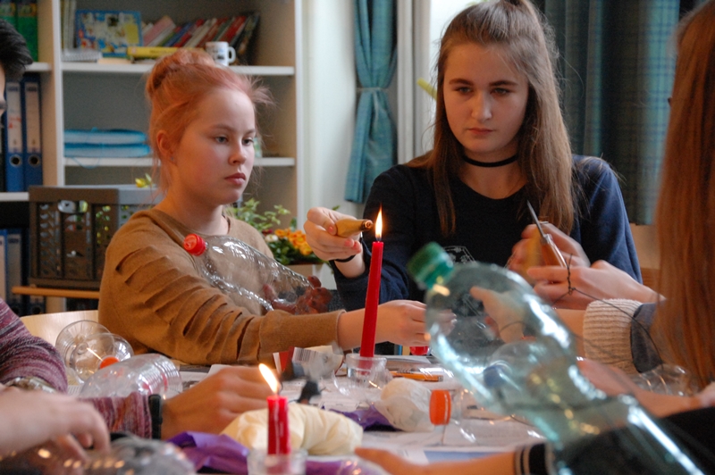 Am 3. Tag wurde es praktisch: in einem Up-Cycling-Workshop mit Andrea Hille wurden Portemonnaies aus Milch- und Safttüten (Tetra Paks), Jonglierbälle aus alten T-Shirts und Plastiktüten sowie kleine Häkelkörbchen aus „Plastik-Wolle“ (zerschnittene Plastiktüten) hergestellt. Erstaunlich war das Interesse einiger Jungen am Häkeln – sie wollten mal was Neues ausprobieren, hieß es. Da sich aber das Häkeln mit hauchdünnen Plastikstreifen – ohne Vorkenntnisse – als ziemlich knifflig erwies, blieb das große Erfolgserlebnis leider aus. Immerhin: sie hatten es versucht – Repekt! Die Jonglierbälle und Portemonnaies gelangen dagegen ohne große Probleme.