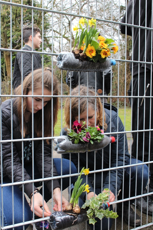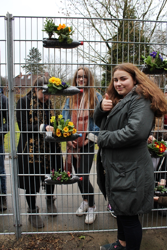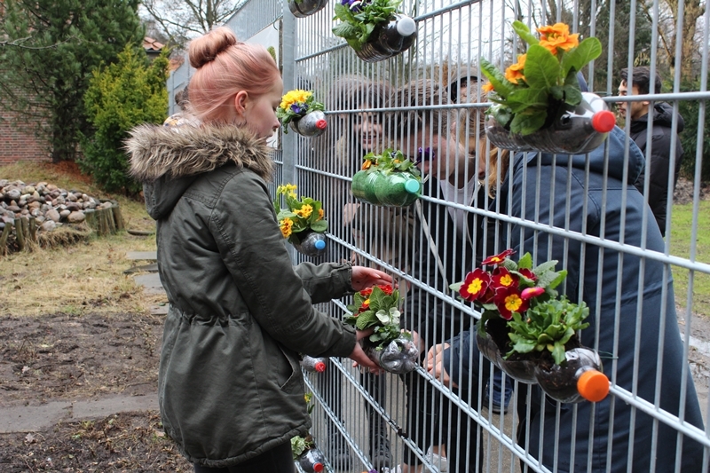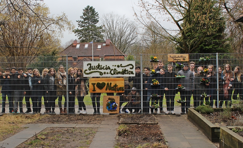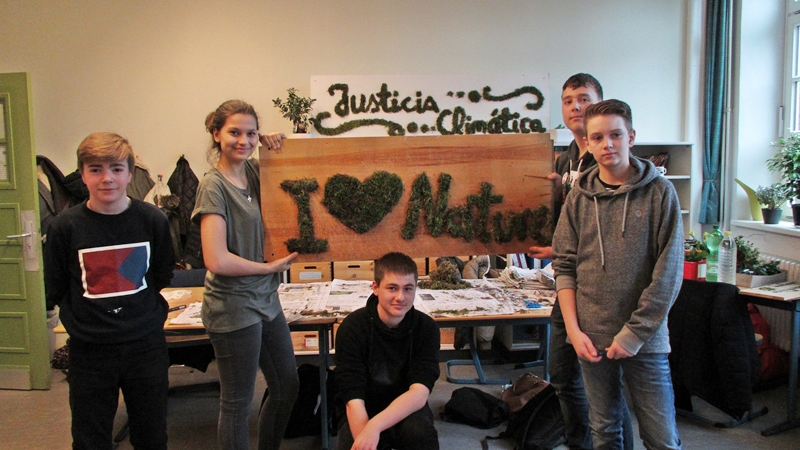len bunten Frühblühern bepflanzten, erstellten die anderen aus Moos, Joghurt und alten Holzplatten (die wir zuvor aus dem Sperrmüll der Schule gezogen hatten), drei tolle Moosgraffitis, darunter eines mit dem spanischen Schriftzug „justicia climática“ (Klimagerechtigkeit). Dann wurden die Moos-Graffitis mit den bepflanzten Flaschen als kleines vertikales Gartenprojekt für die ganze Schule sichtbar im Schulgarten installiert. Zum Glück machte dabei sogar der Hamburger Dauerregen eine Pause!