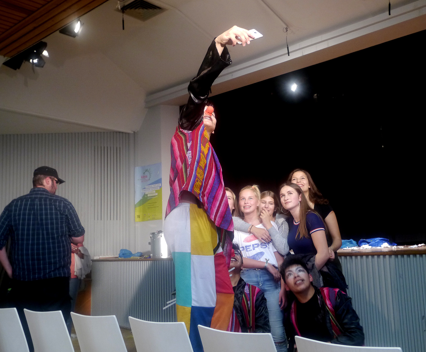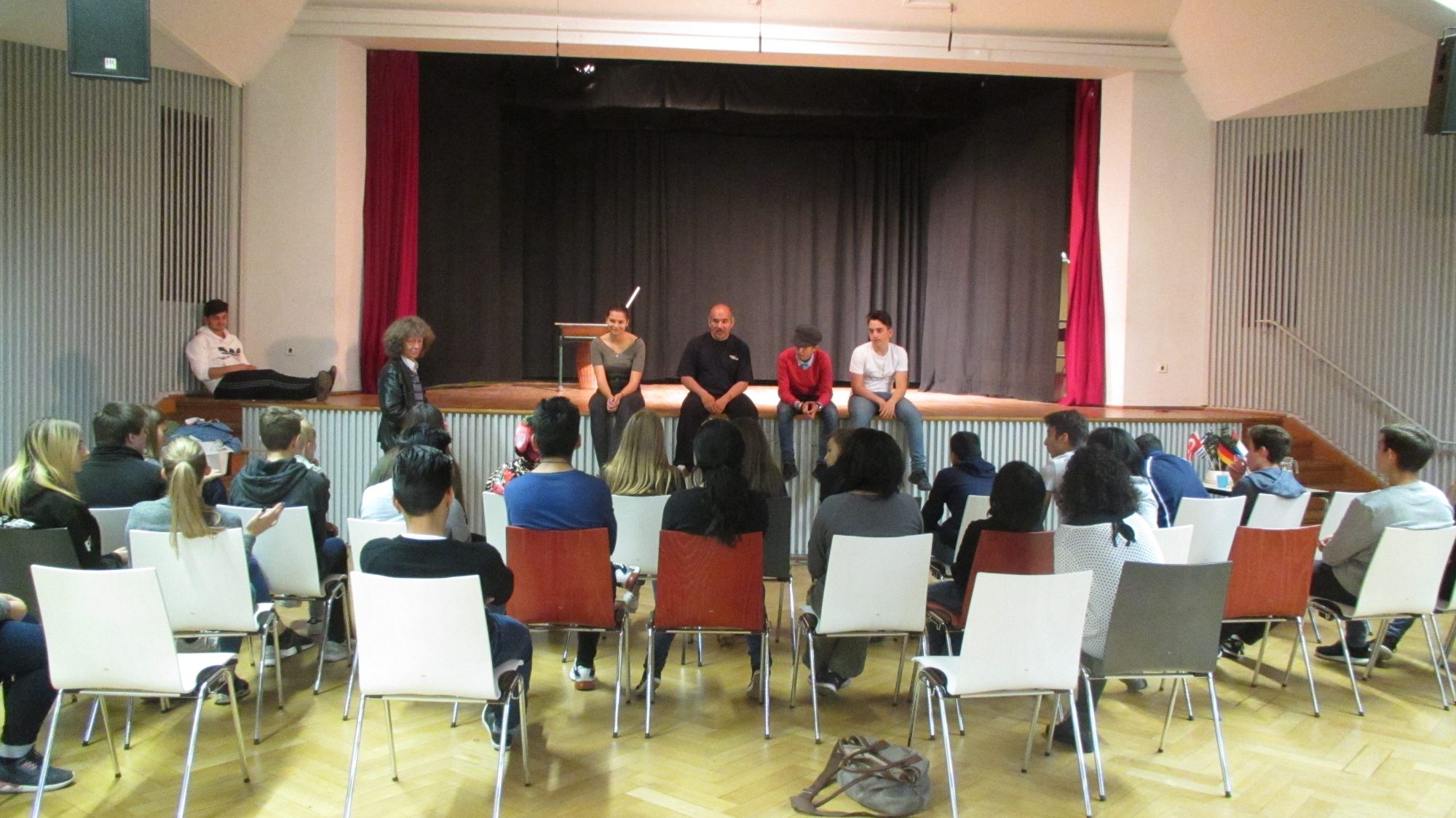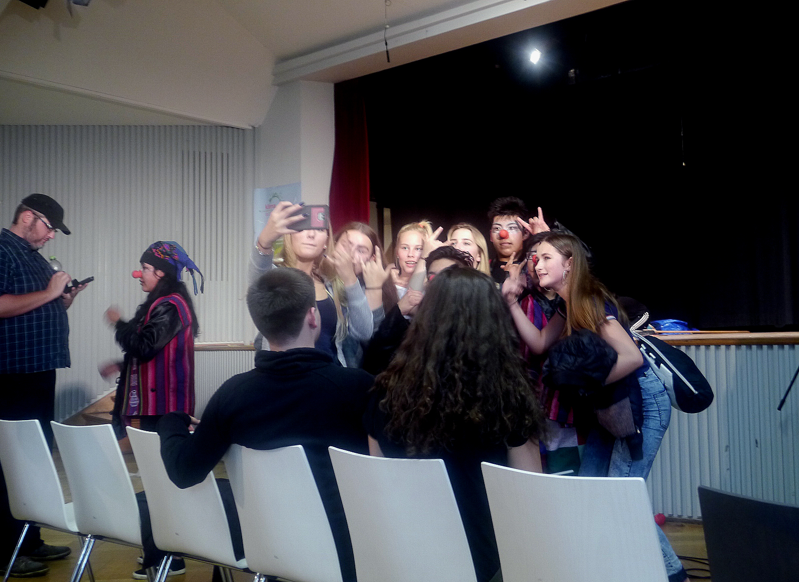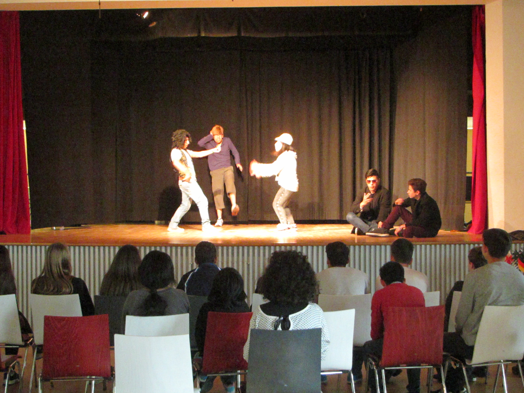Am Freitag dann waren nach nur drei Tagen intensiver Arbeit etliche, erstaunlich gut ausgearbeitete, teils ernste, teils lustige Szenen entstanden. Die Themen waren: klimafreundliche Schule, die Welt in 50 Jahren, die Reise eines T-Shirts, Folgen des Plastikmüll und Klimaflüchtlinge. Am Nachmittag dann wurden diese Szenen zu einer bunten und abwechslungsreichen Show verknüpft, die von den anwesenden rund 200 Schüler*innen, Gastfamilien und Lehrer*innen mit Zwiwchenapplaus und viel Abschlussbeifall bedacht wurde. Nur mit dem gemeinsamen Tanzen klappte es dann doch wieder nicht so recht. Zu groß waren hier die Hemmungen auf Seiten der Hamburger Schüler*innen…