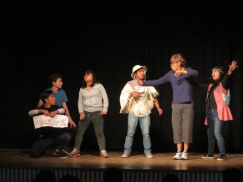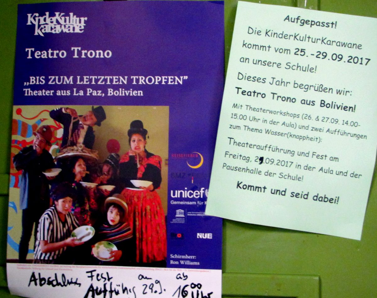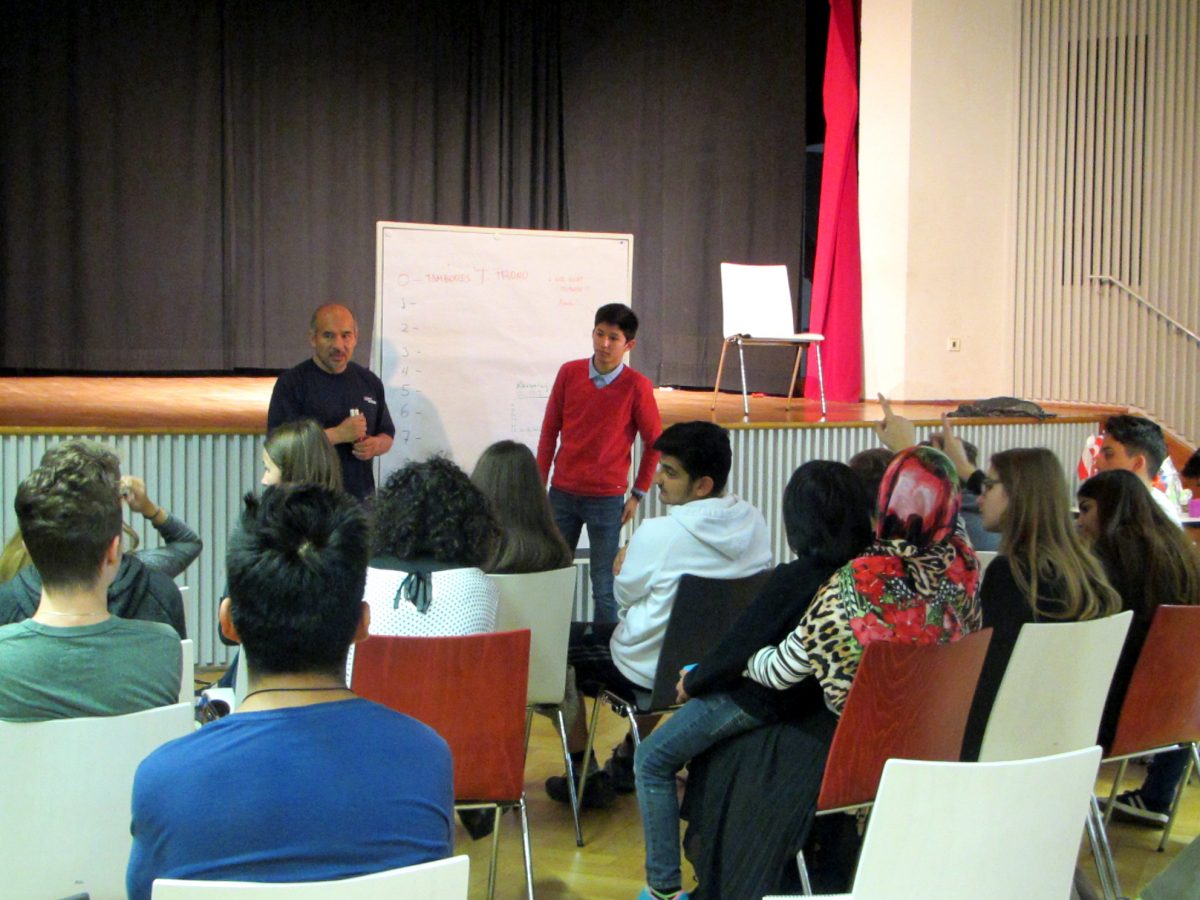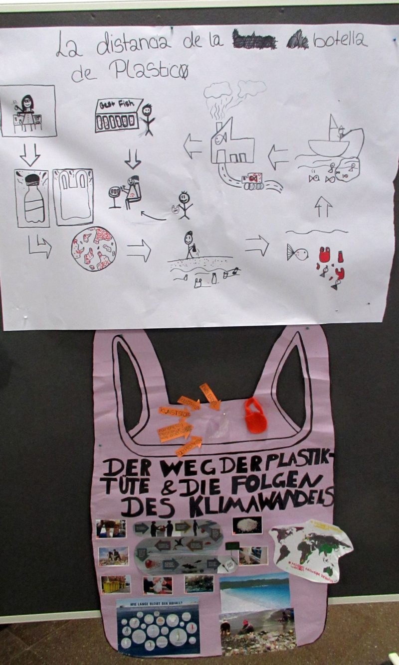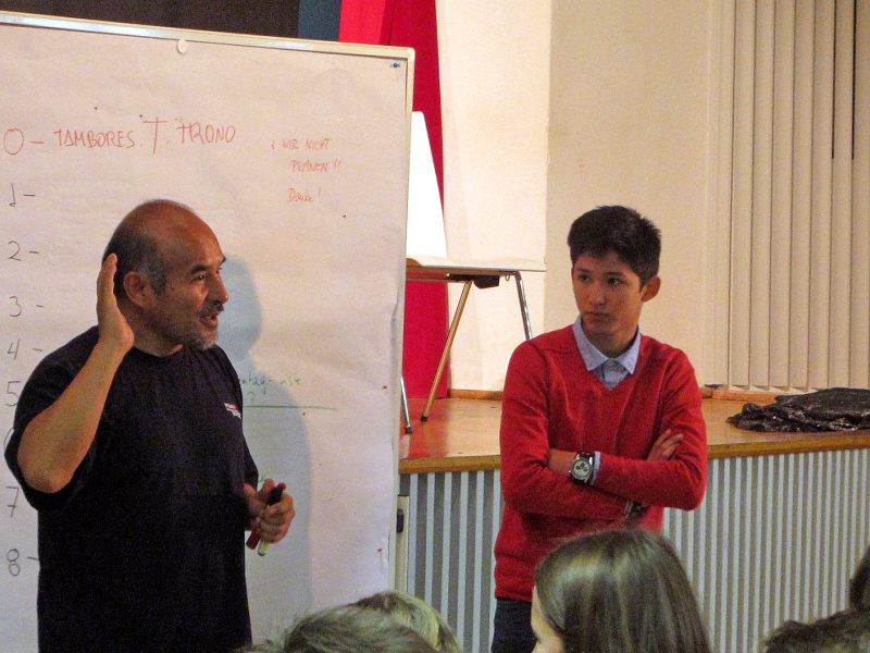 In den Workshops, die die Schüler*innen mit den bolivianischen Jugendlichen durchführten, knüpften sie an die Themen und das erarbeitete Wissen aus ihrer Projektwoche im Februar an: Die dort erarbeiteten Plakate wurden in Kleingruppen ins Spanische übersetzt, mit den bolivianischen Gästen diskutiert und anschließend in kleine Szenen umgesetzt. So entstand ein großer thematischer Bogen vom Projektbeginn im Frühjahr bis hin zu dieser Begegnungswoche im Herbst.