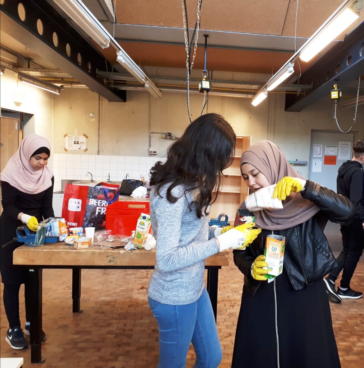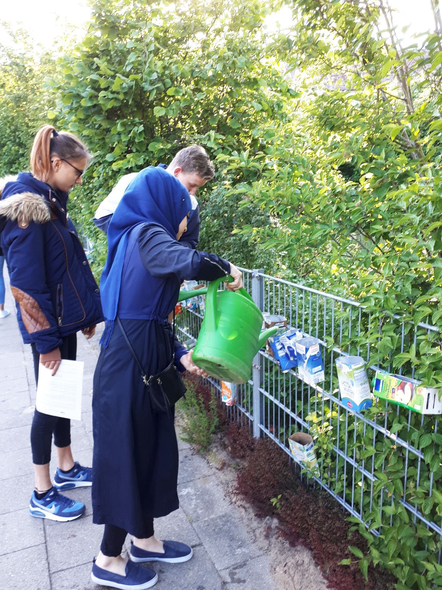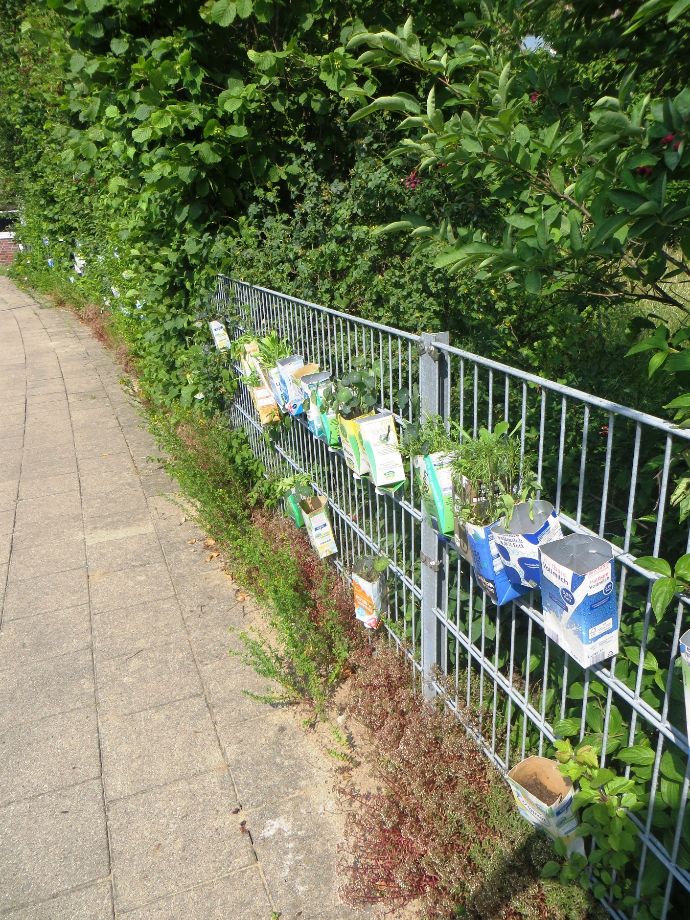 Dagegen wollen unsere Schüler*innen aus der CREACTIV-Klasse 8e (jetzt 9e) etwas tun! In alte Tetrapack-Packungen haben wir Anfang Mai Blütensamen von Pflanzen gesät, die Bienen – vor allem Wildbienen – und Schmetterlingen als Nahrung dienen. Diese wurden dann am Zaun unseres Schulgartens befestigt. Einige 5. und 6. Klassen und eine 12. Klasse haben sich ebenfalls an der Pflanzaktion beteiligt. Auf jedes Tetrapack schrieben die Bepflanzer*innen ihre Namen – und mussten ihre Pflanzen daraufhin auch pflegen!