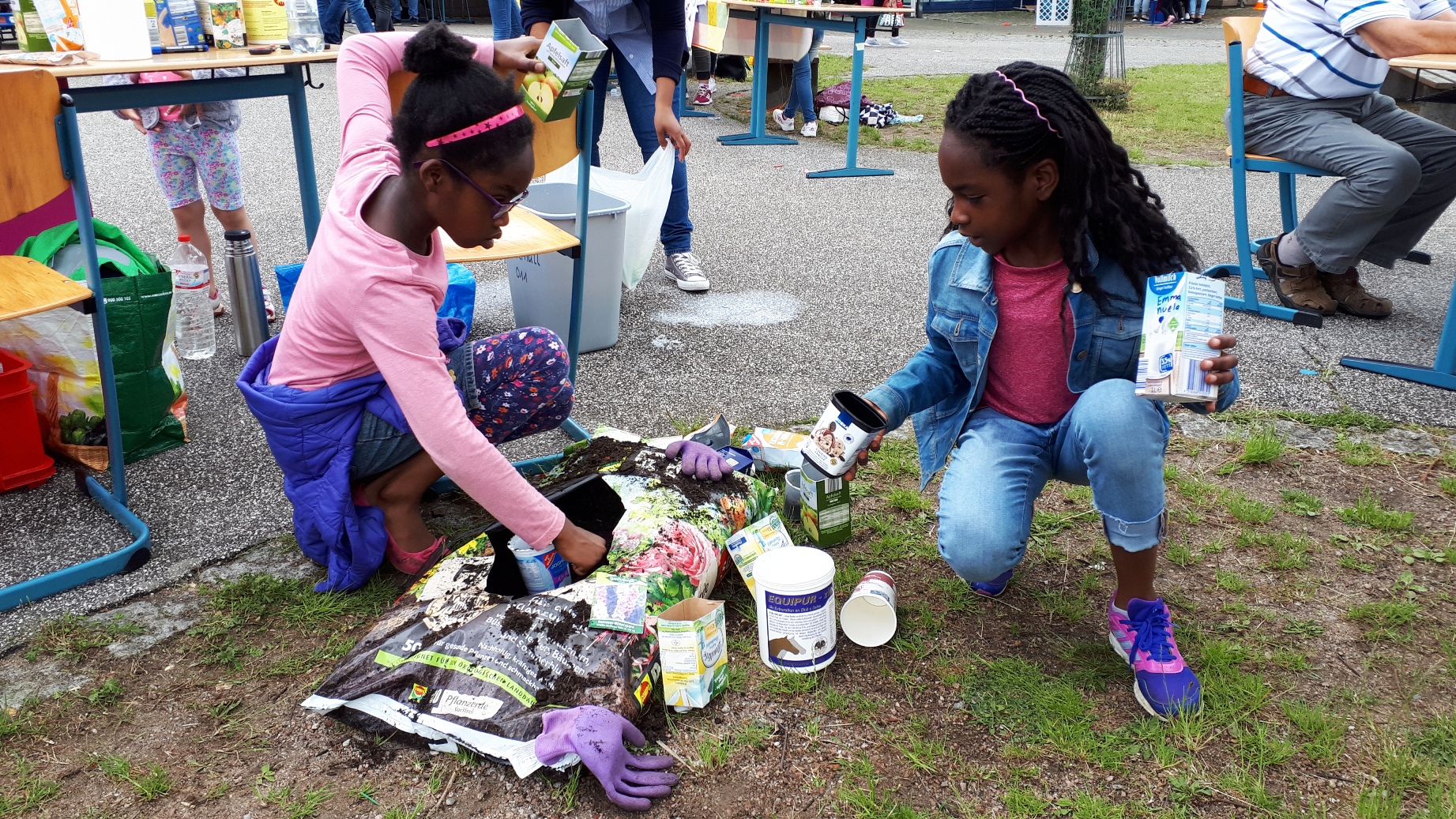 Neben den Postkarten boten wir den Besucher*innen an unserem Stand an, einen Tetrapack mit einer Blütensamenmischung zu bepflanzen, den sie mit nach Hause nehmen konnten. Einzige Voraussetzung: Der kleine Pflanz“topf“ musste draußen den Sommer über aufzustellen sein, denn die heranwachsenden Pflanzen sollen mit ihren Blüten den (Wild-)Bienen und Schmetterlingen als Nahrung dienen.