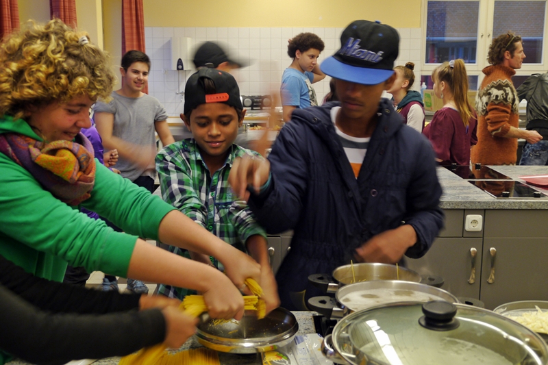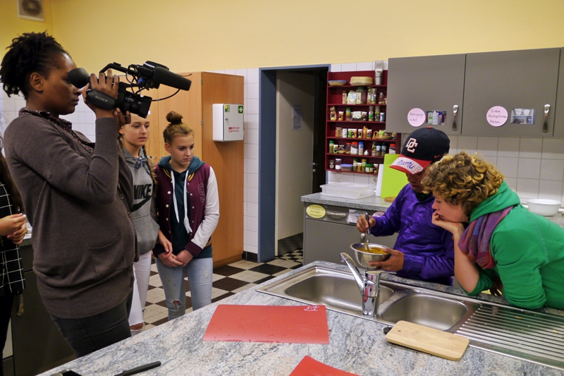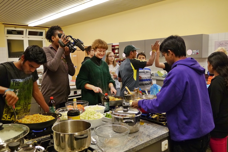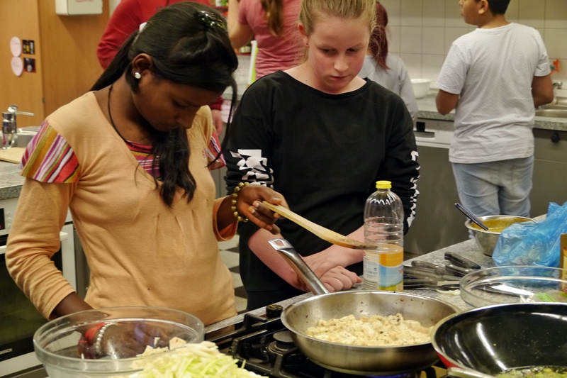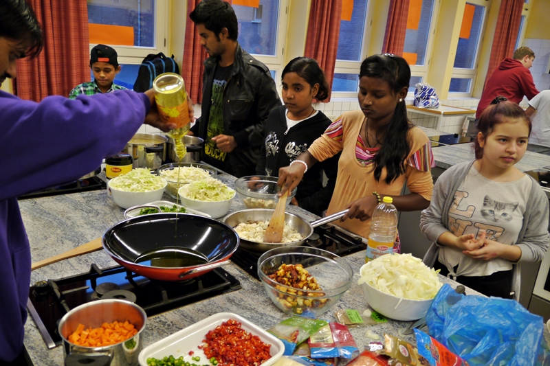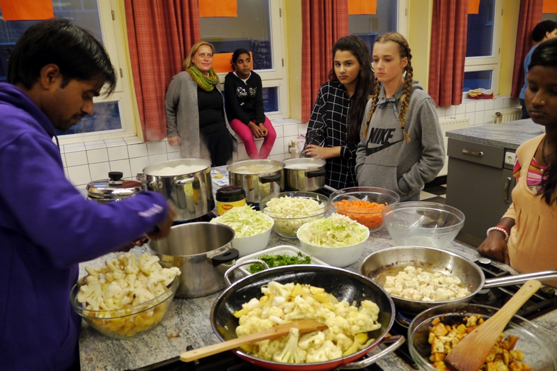 Am Donnerstag (6.10.) fand ein deutsch-indisches Koch-Event in der Stadteilschule Eidelstedt statt. Zunächst wollten die Gastgeber*innen für die indischen Gäste kochen, aber denen schmeckt das hiesige Essen oft etwas fade, da sie es einfach viel gewürzter kennen und mögen. So übernahmen kurzerhand sie die Regie beim Einkaufen und Kochen. Gute zwei Stunden wurde in der großen Schulküche gemeinsam geschnippelt und gerührt, probiert und gebrutzelt. Vegetarisch, versteht sich! Dabei gab es etliche für die Hamburger Schüler*innen unbekannte Zutaten zu entdecken. Zur Überbrückung der Wartezeit wurde heißer gesüßter Chai gereicht und ein Video über die Geschichte der Dreamcatchers gezeigt.