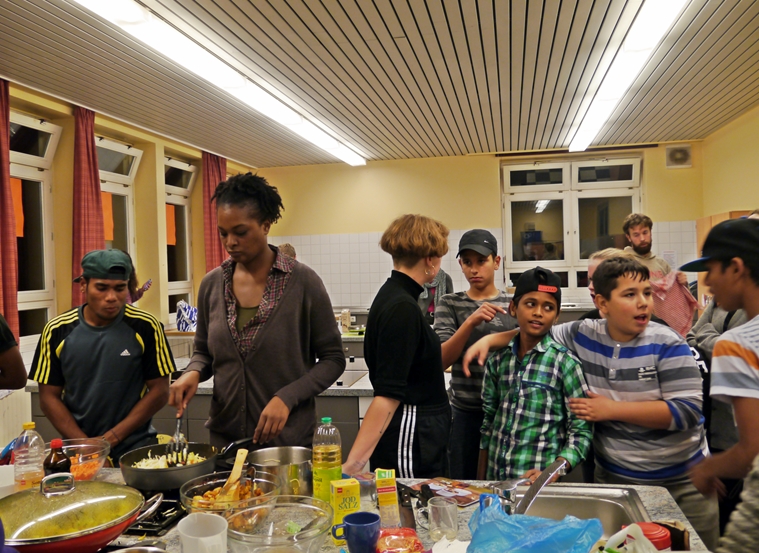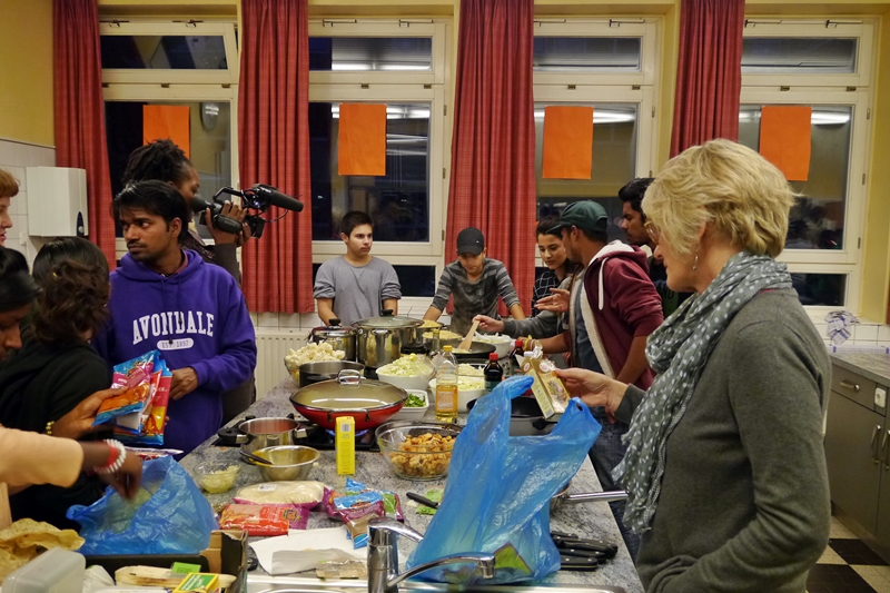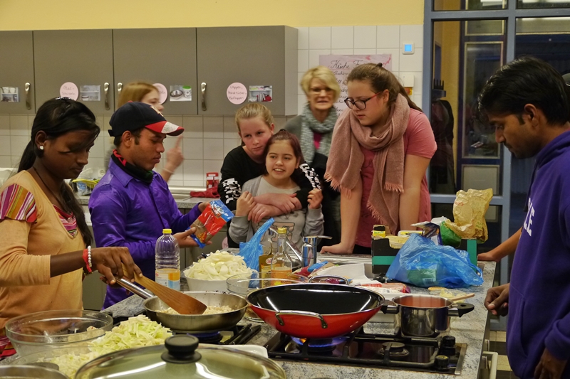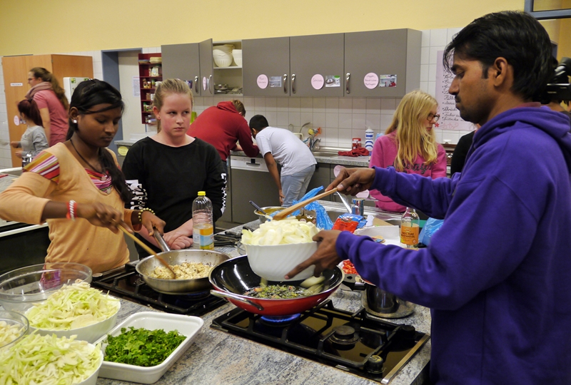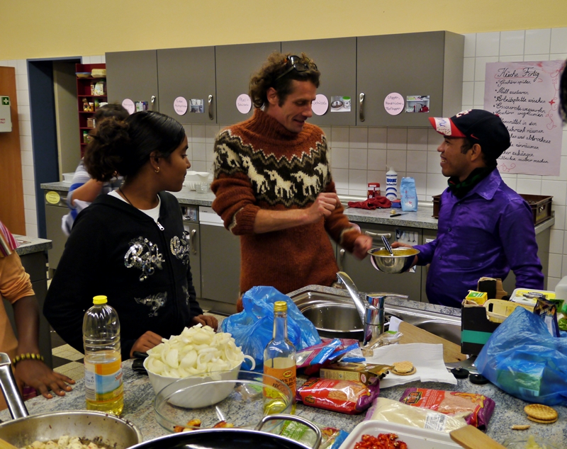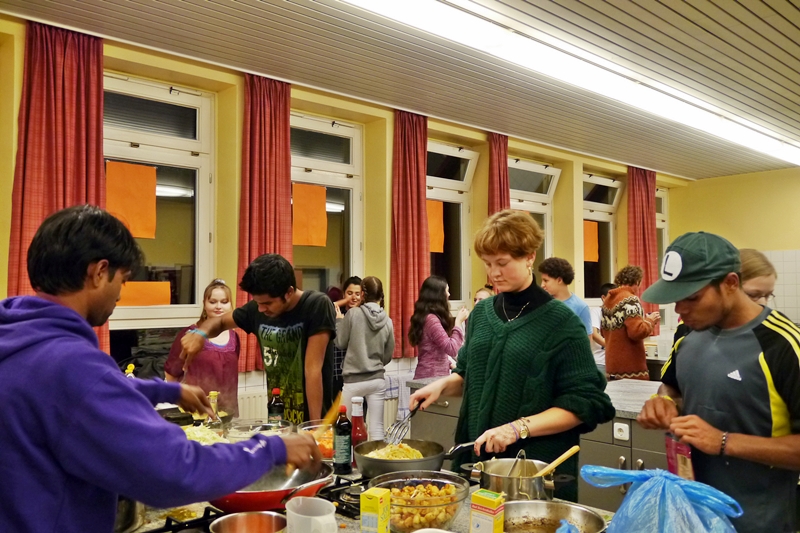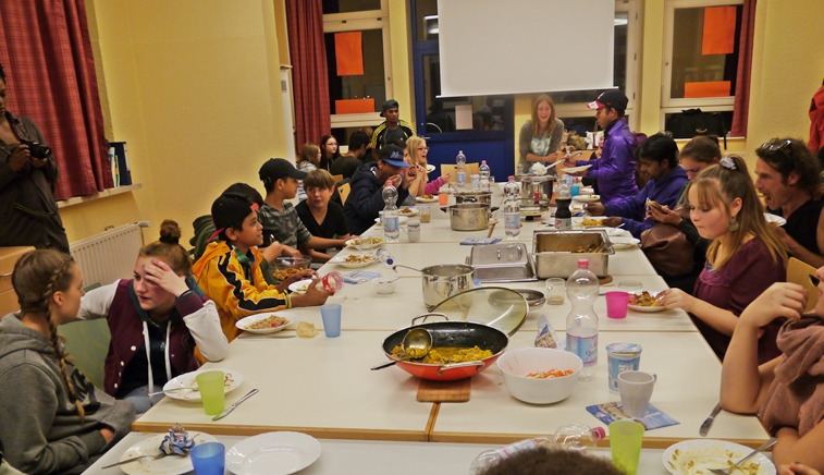 Sprachbarrieren waren schnell überwunden und als die großen Töpfe mit Essen (Nudeln, Reis, Gemüse, indischer Käse, Salat, Joghurt) dann auf dem Tisch standen, waren schon längst neue Freundschaften geschlossen und Adressen ausgetauscht. Nun war nur noch die Frage: wer will eurpäisch mild oder wer indisch scharf? Die meisten entschieden sich für die „milde“ Nudel-Variante – und mussten schnell feststellen, dass auch diese ihnen die Tränen in die Augen schießen ließ. Da half nur jede Menge Joghurt dazu! Die indischen Gäste kippten währenddessen noch mehr Chili-Sosse auf ihren ohnehin schon scharfen Reis. Alles Gewohnheits- und Geschmacksache!