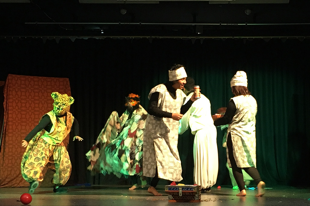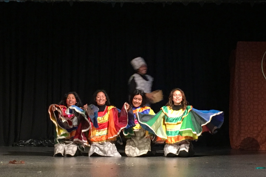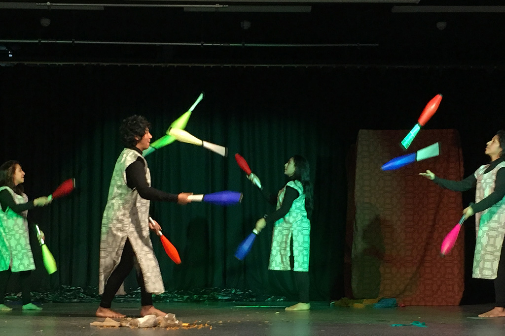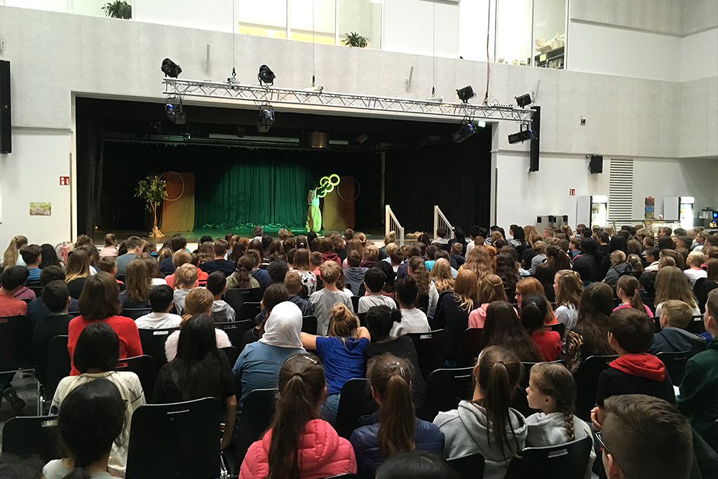 In der vollbesetzten Pausenhalle verfolgten rund 400 Schülerinnen und Schüler mit Spannung und Szenenapplaus die künstlerischen Darbietungen der 7 peruanischen Jugendlichen aus Villa El Salvador. Zwei Jahren hatten sie an der Show gearbeitet, hatten Mythen und Kulturen aus dem Regenwald studiert, über Hintergründe und Folgen des Klimawandels in Peru recherchiert, hatten ihre Ideen dazu in bunte Phantasiekostüme und Masken umgesetzt, passende Utensilien zusammen getragen, schwierige Akrobatik- und Zirkuselemente eingeübt und aus allem eine eindrucksvolle Bühnenperformance mit ausgefeilter Licht- und Musikdramaturgie entwickelt.