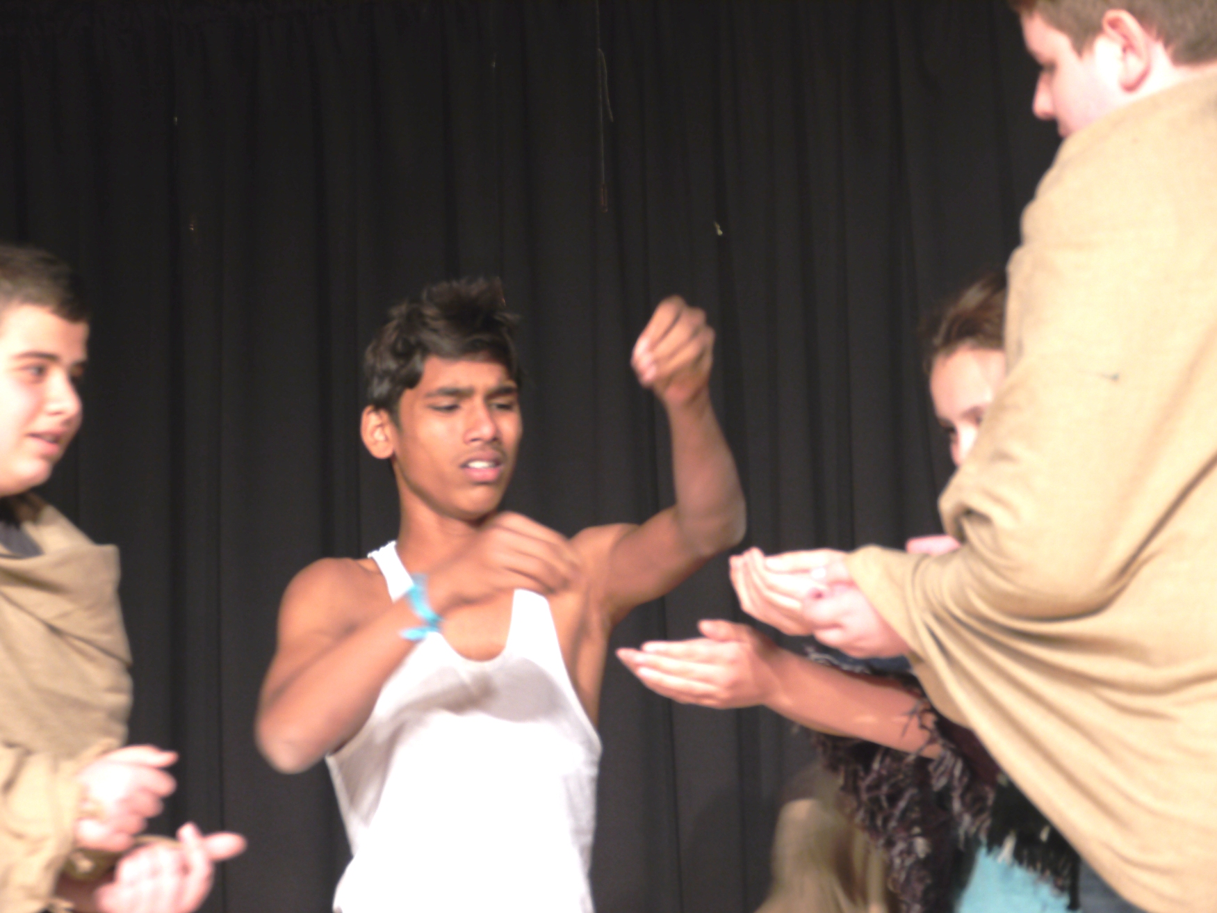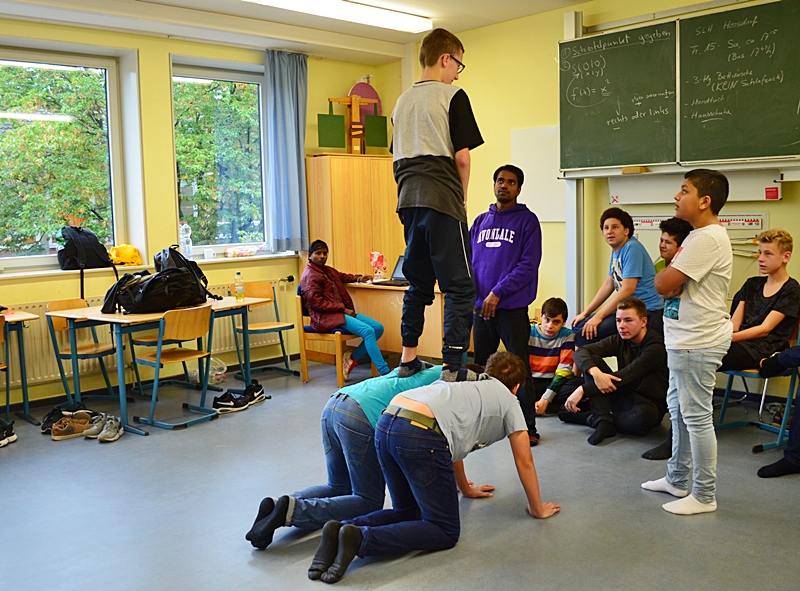Mit rund 50 Schüler*innen der Klassen 7d und 8d wurden in drei Schauspiel- und Tanzworkshops kleine Szenen zum Thema „Klimagerechtigkeit“ entwickelt. Das Eis zwischen den indischen und deutschen Jugendlichen war schnell gebrochen: Insbesondere nach dem interkontinentalem Kochevent in der Schulküche waren sprachliche Barrieren kein Thema mehr. Kommuniziert wurde durch Tanz und Theater und alle waren mit unglaublich viel Engagement und Einsatz dabei.