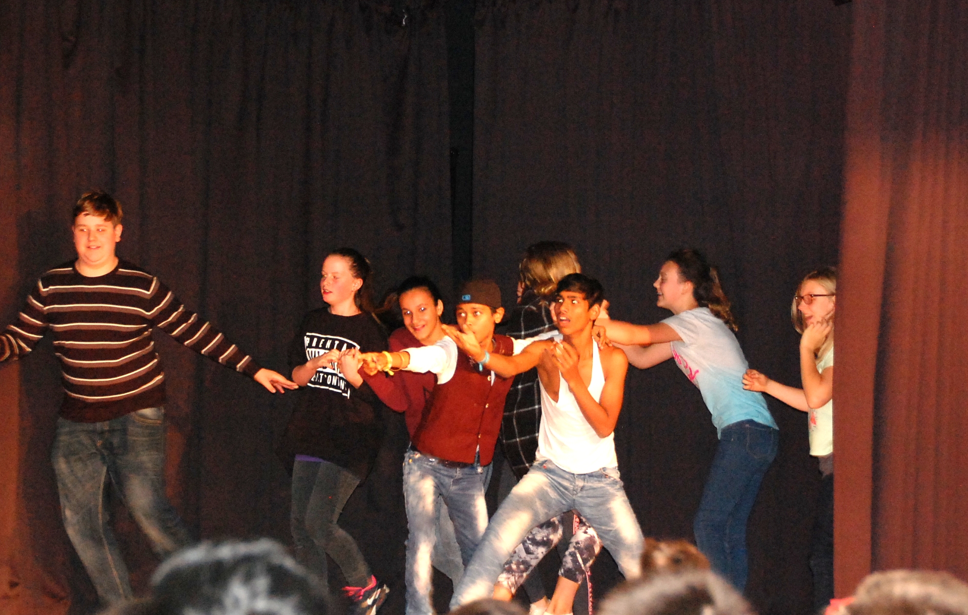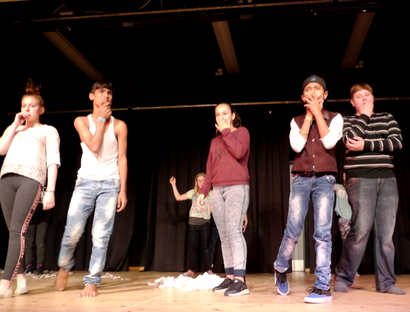 Vor gebanntem Publikum präsentierten die Schüler*innen ihre Antworten auf diese Frage und wurden mit kräftigem Applaus bedacht! Wenn man zudem bedenkt, dass die Szenen zum Teil nur an einem Tag entwickelt und eingeprobt wurden, dann gebührt  den Gästen und Gastgeber*innen, den Lehrer*innen und Trainer*innen ein riesengroßes Lob!